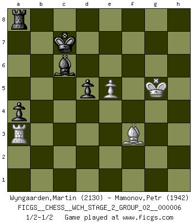 Last move : 1/2-1/2 2010 August 12 14:59:50 [Event "FICGS__CHESS__WCH_STAGE_2_GROUP_02__000006"] [Site "FICGS"] [Date "2009.11.03"] [Round "1"] [White "Wyngaarden,Martin"] [Black "Mamonov,Petr"] [Result "1/2-1/2"] [WhiteElo "2130"] [BlackElo "1942"] 1.d4 d5 2.c4 c6 3.Nf3 Nf6 4.Nc3 e6 5.e3 Nbd7 6.Qc2 Bd6 7.g4 Nxg4 8.Rg1 Qf6 9.Rxg4 Qxf3 10.Rxg7 Nf6 11.Rg5 Qh1 12.f4 h5 13.h3 Be7 14.Qg2 Qxg2 15.Rxg2 h4 16.Bd3 Nh5 17.b3 Bd7 18.Kf2 O-O-O 19.Bb2 dxc4 20.bxc4 e5 21.fxe5 f6 22.exf6 Rdf8 23.Rag1 Rxf6+ 24.Ke1 Ng3 25.Ne4 Rf3 26.Nxg3 hxg3 27.Kd2 Rxh3 28.Be4 Rf2+ 29.Kd3 Rh2 30.Bc3 Rhxg2 31.Bxg2 Rxa2 32.Bf3 Bh3 33.Rxg3 Bf1+ 34.Ke4 Bxc4 35.Rh3 Rf2 36.Rh7 Kd8 37.Bg4 Bb3 38.Ke5 Bg8 39.Rh5 Kc7 40.Bf5 b6 41.e4 a5 42.d5 cxd5 43.Bd4 Rg2 44.Rh3 Bf8 45.Rc3+ Kb7 46.Bc8+ Kb8 47.Kf4 Bd6+ 48.e5 Bc7 49.Bg4 Bh7 50.Rb3 Bc2 51.Rb5 Ba4 52.Rb1 Bc6 53.Bf3 Rc2 54.Bxb6 Bxb6 55.Rxb6+ Kc7 56.Rb3 a4 57.Rd3 Rc5 58.Kf5 Ra5 59.Ra3 Ra6 60.Kg5 Ra8 1/2-1/2 QGD Slav : 4.Nc3 Queenside Castling by player Black (move 18) 10 pieces endgame at move 54 : White KRBP , Black KRBBPP WHITE : King + 1 Rook 1 Bishop 1 Pawn BLACK : King + 1 Rook 2 Bishops 2 Pawns 9 pieces endgame at move 55 : White KRBP , Black KRBPP WHITE : King + 1 Rook 1 Bishop 1 Pawn BLACK : King + 1 Rook 1 Bishop 2 Pawns This chess game ended in a draw. Follow this game move after move (download)Morphy was probably the greatest genius of them all. (Bobby Fischer) Wie gewinnt Tal? Er entwickelt alle seine Figuren in die Brettmitte und opfert sie dann irgendwo. (Robert James Fischer) No es suficiente ser un buen jugador, se debe también de jugar bién. (Siegbert Tarrasch) Je menace de comprendre la position. (Anonyme) Perhaps the current trend of many chess professionals taking up the more lucrative pastime of poker is not a wholly negative one. It may not be too late for humans to relearn how to take risks in order to innovate and thereby maintain the advanced lifestyles we enjoy. And if it takes a poker-playing supercomputer to remind us that we can't enjoy the rewards without taking the risks, so be it. (The Chess Master and the Computer, by Garry Kasparov - 2010)