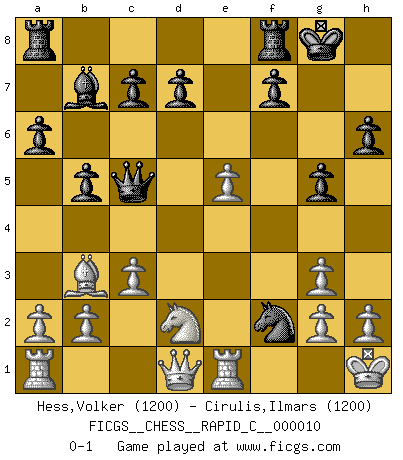Last move : 0-1 2006 November 7 15:21:31 [Event "FICGS__CHESS__RAPID_C__000010"] [Site "FICGS"] [Date "2006.10.02"] [Round "1"] [White "Hess,Volker"] [Black "Cirulis,Ilmars"] [Result "0-1"] [WhiteElo "1200"] [BlackElo "1200"] 1.e4 e5 2.Nf3 Nc6 3.Bb5 Nf6 4.O-O Bc5 5.Re1 a6 6.Ba4 b5 7.Bb3 O-O 8.c3 Bb7 9.d4 Bd6 10.dxe5 Nxe5 11.Bg5 h6 12.Nxe5 Bxe5 13.Bh4 g5 14.Bg3 Bxg3 15.fxg3 Qe7 16.e5 Ne4 17.Nd2 Qc5+ 18.Kh1 Nf2+ 0-1 Ruy Lopez : Berlin defense, Beverwijk variation Kingside Castling by player White (move 4) Kingside Castling by player Black (move 7) Player Black won this chess game. Follow this game move after move (download)When I asked Fischer why he had not played a certain move in our game, he replied: 'Well, you laughed when I wrote it down !' (Mikhail Tal) Im Leben werden Partien nie so unstrittig gewonnen wie im Spiel (Emanuel Lasker) No existe un remordimiento como el remordimiento del Ajedrez. (H. G. Wells) Aucun coup ne doit être joué sans but. (Pedro Damiano) A cynic is a man who knows the price of everything but the value of nothing. (Oscar Wilde)