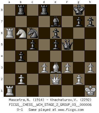 Last move : 0-1 2010 February 2 20:44:58 [Event "FICGS__CHESS__WCH_STAGE_2_GROUP_03__000006"] [Site "FICGS"] [Date "2009.11.03"] [Round "1"] [White "Mascetra,Nicola"] [Black "Khachaturov,Vadim"] [Result "0-1"] [WhiteElo "1914"] [BlackElo "2292"] 1.e4 e5 2.Nf3 Nc6 3.Bb5 a6 4.Ba4 Nf6 5.O-O Be7 6.Nc3 b5 7.Bb3 d6 8.a4 b4 9.Nd5 Na5 10.Ba2 Nxd5 11.Bxd5 c6 12.Ba2 c5 13.Bd5 Rb8 14.d3 O-O 15.Be3 Be6 16.Bxe6 fxe6 17.Qe2 Qe8 18.h3 Qg6 19.Kh1 Nc6 20.Nd2 Rbd8 21.Rae1 Rc8 22.Nc4 d5 23.Nb6 Rcd8 24.a5 Nxa5 25.Ra1 Nc6 26.Rxa6 dxe4 27.Nc4 exd3 28.cxd3 Rc8 29.f3 Qf5 30.Rfa1 Rfd8 31.Nb6 Rb8 0-1 This chess game has been lost on time (started : 2009.11.03 19:53:17) Ruy Lopez : Closed defense Kingside Castling by player White (move 5) Kingside Castling by player Black (move 14) Player Black won this chess game. Follow this game move after move (download)What is the object of playing a gambit opening?... To acquire a reputation of being a dashing player at the cost of losing a game. (Siegbert Tarrasch) Es liegt in der Natur, vernüftig zu denken und unlogisch zu handeln. (Anatole France) El Ajedrez tiene tanto misterio como las mujeres. (Purdy) Le profane ne songe pas à la somme de jouissance dont il se prive, qui méconnaît ce jeu aux ressources aussi variées que passionnantes. (Jean-Marie Jeanton-Lamarche) A belief is an idea the mind possesses, an idea that possesses the mind. (Robert Oxden Bolton)