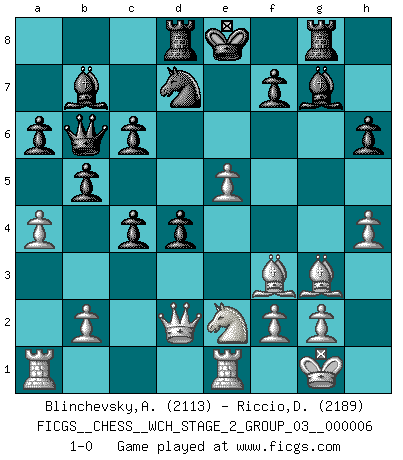 Last move : 1-0 2009 December 22 11:27:13 [Event "FICGS__CHESS__WCH_STAGE_2_GROUP_03__000006"] [Site "FICGS"] [Date "2009.11.03"] [Round "1"] [White "Blinchevsky,Alexander"] [Black "Riccio,Domenico"] [Result "1-0"] [WhiteElo "2113"] [BlackElo "2189"] 1.d4 d5 2.c4 c6 3.Nf3 Nf6 4.Nc3 e6 5.Bg5 h6 6.Bh4 dxc4 7.e4 g5 8.Bg3 b5 9.Be2 Bb7 10.h4 g4 11.Ne5 Nbd7 12.Bxg4 Nxe5 13.Bxe5 Rg8 14.Bf3 Nd7 15.Bg3 Qb6 16.O-O Rd8 17.a4 Bg7 18.Ne2 e5 19.Re1 a6 20.Qd2 exd4 21.e5 1-0 QGD Slav : 4.Nc3 Kingside Castling by player White (move 16) Player White won this chess game. Follow this game move after move (download)Modern Chess is too much concerned with things like Pawn structure. Forget it, Checkmate ends the game. (Nigel Short) Ein unbeabsichtigtes Patt ist der Gipfel der Dummheit. (Anonymous) El poder defensivo de una pieza clavada, solamente es imaginario. (Aaron Nimzovich) Les Echecs, c'est l'art de la guerre sans les charniers, c'est la résurrection des morts tombés au champ d'honneur, l'espoir perpétuel, la suprématie de l'intelligence sur la force, la culture de l'esprit. (F. Szpiner) Those who make the worst use of their time are the first to complain of its brevity. (Jean de la Bruyere)