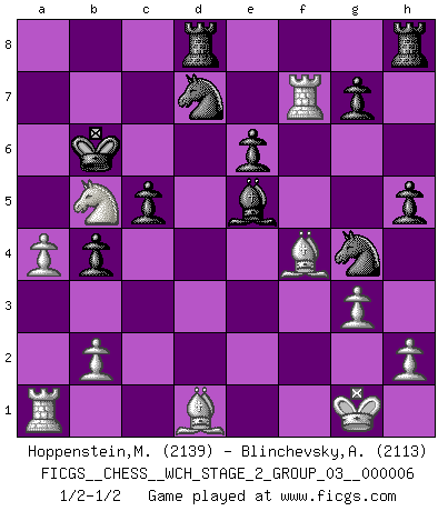 Last move : 1/2-1/2 2009 December 13 13:52:3 [Event "FICGS__CHESS__WCH_STAGE_2_GROUP_03__000006"] [Site "FICGS"] [Date "2009.11.03"] [Round "1"] [White "Hoppenstein,Michael"] [Black "Blinchevsky,Alexander"] [Result "1/2-1/2"] [WhiteElo "2139"] [BlackElo "2113"] 1.d4 d5 2.c4 c6 3.Nc3 Nf6 4.e3 e6 5.Nf3 Nbd7 6.Bd3 dxc4 7.Bxc4 b5 8.Bd3 Bb7 9.O-O a6 10.e4 c5 11.d5 Qc7 12.dxe6 fxe6 13.Bc2 Bd6 14.Ng5 Nf8 15.f4 O-O-O 16.Qe2 h6 17.Nf3 Bxf4 18.e5 Bxf3 19.Rxf3 Bxe5 20.a4 Ng4 21.g3 b4 22.Qxa6+ Qb7 23.Qxb7+ Kxb7 24.Nb5 Nd7 25.Rf7 Kb6 26.Bd1 h5 27.Bf4 1/2-1/2 QGD Slav defense Kingside Castling by player White (move 9) Queenside Castling by player Black (move 15) This chess game ended in a draw. Follow this game move after move (download)Openings teach you openings. Endgames teach you chess ! (Stephan Gerzadowicz) Der zweitbeste Zug ist oft der einzig richtige. (Savielly Grigorievitsch Tartakower) El Ajedrez moderno está demasiado preocupado con cosas como la estructura de Peones. Olvidenlo, el Jaque Mate termina la partida. (Nigel Short) La victoire dans une partie d'Echecs appartient la plupart du temps à celui qui voit un peu plus loin que l'adversaire. (Lasker) Patience, use the Force, think ! (Obi-Wan Kenobi in Star Wars ep.2)