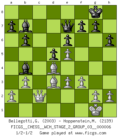 Last move : 1/2-1/2 2009 November 15 21:43:49 [Event "FICGS__CHESS__WCH_STAGE_2_GROUP_03__000006"] [Site "FICGS"] [Date "2009.11.03"] [Round "1"] [White "Bellegotti,Giorgio"] [Black "Hoppenstein,Michael"] [Result "1/2-1/2"] [WhiteElo "2003"] [BlackElo "2139"] 1.d4 d5 2.c4 c6 3.Nf3 e6 4.e3 Nf6 5.Nc3 Nbd7 6.Bd3 Be7 7.O-O O-O 8.b3 b6 9.Bb2 Bb7 10.Qc2 h6 11.Rad1 Qc7 12.Rfe1 Rad8 13.cxd5 cxd5 14.Rc1 Qb8 15.Qe2 Ne4 16.Rc2 Rc8 17.Rec1 Nxc3 18.Rxc3 Rxc3 19.Rxc3 Rc8 20.Qc2 Rxc3 21.Qxc3 Bd6 22.Ne5 Nxe5 23.dxe5 Bf8 24.Qc2 Qd8 25.Bd4 Bb4 26.f3 Qe7 1/2-1/2 QGD Slav : 3.Nf3 Kingside Castling by player White (move 7) Kingside Castling by player Black (move 7) This chess game ended in a draw. Follow this game move after move (download)Chess is a matter of delicate judgment, knowing when to punch and how to duck. (Bobby Fischer) Ich verlor meine Bürgerrechte, mein Gehalt wurde mir nicht mehr bezahlt und ich wurde zensiert und durfte nicht mehr ins Ausland reisen. [nach dem Match Fischer-Taimanov 6:0] (Mark Taimanov) Cualquier cambio de material en una posición debe venir por medio de un mate, una captura o promoción de Peón. (Purdy) La vie est comme un jeu d'échecs : nous esquissons un plan, mais celui-ci est tributaire de ce que daignent faire l'adversaire aux échecs et le destin dans la vie. (Arthur Schopenhauer) Ah, beer! The cause of, and the solution to, all of life's problems. (Homer Simpson)