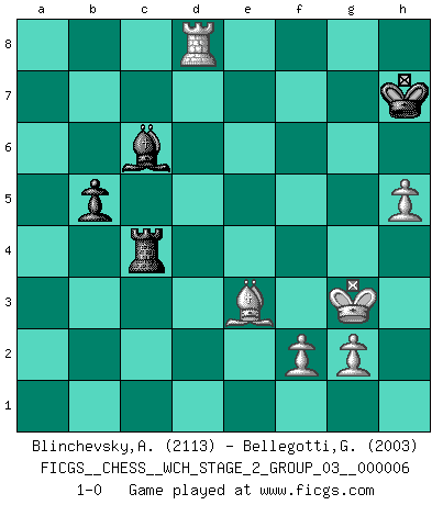 Last move : 1-0 2010 January 3 16:12:3 [Event "FICGS__CHESS__WCH_STAGE_2_GROUP_03__000006"] [Site "FICGS"] [Date "2009.11.03"] [Round "1"] [White "Blinchevsky,Alexander"] [Black "Bellegotti,Giorgio"] [Result "1-0"] [WhiteElo "2113"] [BlackElo "2003"] 1.d4 Nf6 2.c4 e6 3.Nf3 d5 4.Nc3 c6 5.e3 Nbd7 6.Bd3 dxc4 7.Bxc4 b5 8.Bd3 Bb7 9.a3 a6 10.b4 a5 11.Rb1 axb4 12.axb4 Nd5 13.Nxd5 exd5 14.Qc2 Bd6 15.e4 dxe4 16.Bxe4 O-O 17.Bxh7+ Kh8 18.O-O g6 19.Bxg6 fxg6 20.Qxg6 Qf6 21.Qh5+ Kg8 22.Qg4+ Qg7 23.Qe6+ Rf7 24.Qxd6 Rxf3 25.Qc7 Rb8 26.Bf4 Rd3 27.Be5 Qf7 28.Bd6 Ba8 29.Rbe1 Re8 30.h3 c5 31.Rxe8+ Qxe8 32.bxc5 Rxd4 33.Ra1 Be4 34.c6 Nf6 35.Be5 Qd8 36.Qxd8+ Rxd8 37.Bxf6 Rc8 38.Bg5 Rxc6 39.Ra8+ Kf7 40.Rb8 Rc5 41.h4 Bc6 42.Kh2 Rc3 43.Be3 Rc4 44.Kg3 Kg6 45.h5+ Kh7 46.Rd8 1-0 Queen's pawn game Kingside Castling by player Black (move 16) Kingside Castling by player White (move 18) 10 pieces endgame at move 38 : White KRBPPP , Black KRBP WHITE : King + 1 Rook 1 Bishop 3 Pawns BLACK : King + 1 Rook 1 Bishop 1 Pawn Player White won this chess game. Follow this game move after move (download)The older I grow, the more I value Pawns. (Keres) Ich brauche nur einen Blick auf das Schachbrett zu werfen, und weiß schon, was in der Stellung steckt, was geschehen kann und was geschehen wird. Alle übrigen suchen und prüfen, ich aber weiß es! (José Raúl Capablanca) Morphy probablemente fue el genio más grande de todos. (Bobby Fischer) Le jeu d'échecs est comme rejeté hors du temps. (Antoine de Saint-Exupéry) All men can see these tactics whereby I conquer, but what none can see is the strategy out of which victory is evolved. (Sun Tzu)