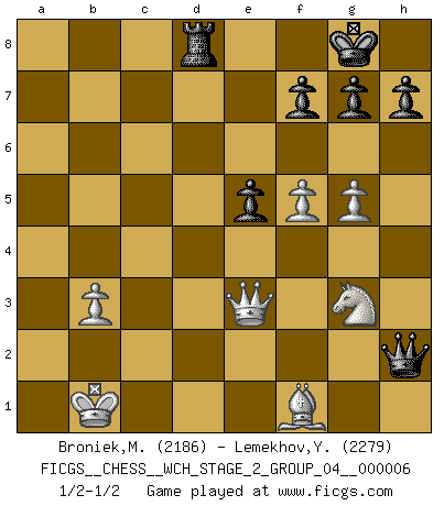 Last move : 1/2-1/2 2010 January 10 20:25:2 [Event "FICGS__CHESS__WCH_STAGE_2_GROUP_04__000006"] [Site "FICGS"] [Date "2009.11.03"] [Round "1"] [White "Broniek,Mariusz Maciej"] [Black "Lemekhov,Yura"] [Result "1/2-1/2"] [WhiteElo "2186"] [BlackElo "2279"] 1.e4 c5 2.Nf3 d6 3.d4 cxd4 4.Nxd4 Nf6 5.Nc3 a6 6.Be3 e5 7.Nb3 Be6 8.f3 Be7 9.Qd2 O-O 10.O-O-O Nbd7 11.g4 b5 12.g5 b4 13.Ne2 Ne8 14.f4 a5 15.f5 Bxb3 16.cxb3 a4 17.bxa4 Rxa4 18.b3 Ra5 19.Kb1 d5 20.exd5 Bc5 21.Bxc5 Nxc5 22.d6 Qa8 23.d7 Nxd7 24.Ng3 Nc7 25.Bg2 Qa7 26.Qxd7 Rxa2 27.Rd2 Ra3 28.Kb2 Ra2+ 29.Kb1 Rxd2 30.Qxd2 Nb5 31.Rc1 Nc3+ 32.Rxc3 bxc3 33.Qxc3 Qg1+ 34.Bf1 Qxh2 35.Qe3 Rd8 1/2-1/2 Sicilian : Najdorf, Byrne (English) attack Kingside Castling by player Black (move 9) Queenside Castling by player White (move 10) This chess game ended in a draw. Follow this game move after move (download)I prefer to lose a really good game than to win a bad one. (David Levy) Schach ist ein schwarz-weisser Dschungel. (Garry Kasparov) Tu cuerpo tiene que estar en óptima condición. Tu Ajedrez se deteriora como lo hace tu cuerpo. No puedes separar la mente y el cuerpo. (Bobby Fischer) Nous vivons dans un monde échiquéen : chaque jour qui passe est un défi à relever. (Philosophe Sasha) When you have everything, sometimes it feels like nothing. (Horatio Caine, C.S.I. Miami)