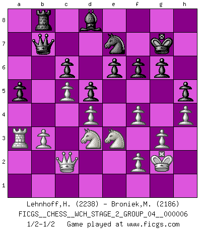 Last move : 1/2-1/2 2010 June 6 13:42:57 [Event "FICGS__CHESS__WCH_STAGE_2_GROUP_04__000006"] [Site "FICGS"] [Date "2009.11.03"] [Round "1"] [White "Lehnhoff,Heinz-Georg"] [Black "Broniek,Mariusz Maciej"] [Result "1/2-1/2"] [WhiteElo "2238"] [BlackElo "2186"] 1.d4 Nf6 2.c4 e6 3.Nf3 d5 4.Nc3 Be7 5.Bf4 O-O 6.e3 Nbd7 7.c5 Nh5 8.Bd3 Nxf4 9.exf4 c6 10.Qc2 h6 11.O-O b6 12.b4 bxc5 13.bxc5 Qa5 14.Rab1 Ba6 15.Bxa6 Qxa6 16.Rb3 Rfb8 17.Rfb1 Bd8 18.Ne2 Bc7 19.Ne1 Rxb3 20.axb3 Rb8 21.g3 Qb5 22.Nd3 a5 23.Nc3 Qa6 24.Ra1 Qb7 25.Ra3 Bd8 26.Nd1 h5 27.h4 Nf6 28.Kg2 Bc7 29.Ne3 g6 30.Qe2 Kg7 31.Qe1 Qb5 32.Qd1 Ng8 33.Qd2 Nh6 34.Qc3 Rf8 35.Ra1 Ng8 36.Qc2 Rb8 37.Ra3 Ne7 38.Qd2 f6 39.Qc2 Re8 40.Qc3 Ra8 41.Qc2 Rb8 42.Qd2 Ng8 43.Qc2 Qb7 44.Qe2 Kf7 45.Qd2 Ne7 46.Qc2 Qb5 47.Qd2 Re8 48.Qc2 Qb7 49.Qc3 Ra8 50.Ra2 Kg7 51.Qc2 Rb8 52.Ra3 Bd8 1/2-1/2 Queen's pawn game Kingside Castling by player Black (move 5) Kingside Castling by player White (move 11) This chess game ended in a draw. Follow this game move after move (download)Chess is really ninety nine percent calculation. (Soltis) Im Schach gibt es keinen Platz für Galanterie. (Irving Chernev) Cuando la partida de Ajedrez termina, el Peón y el Rey regresan a la misma caja. (Irish saying) Le système Elo représente seulement une moyenne. Il est simplement un indicateur de votre stabilité. (Anatoli Karpov) Better than a thousand days of diligent study is one day with a great teacher. (Japanese proverb)
