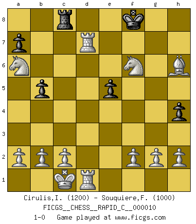 Last move : 1-0 2006 October 9 20:57:49 [Event "FICGS__CHESS__RAPID_C__000010"] [Site "FICGS"] [Date "2006.10.02"] [Round "1"] [White "Cirulis,Ilmars"] [Black "Souquiere,Florence"] [Result "1-0"] [WhiteElo "1200"] [BlackElo "1000"] 1.e4 e5 2.Nc3 Bc5 3.Nf3 f6 4.d4 Bxd4 5.Nxd4 c5 6.Ndb5 Ne7 7.Qd6 O-O 8.Nc7 Nec6 9.Nxa8 Nd4 10.Bc4+ Ne6 11.Qxb8 d6 12.Nc7 d5 13.Bxd5 Bd7 14.Bxe6+ Bxe6 15.Qxd8 Rxd8 16.Nxe6 Rd6 17.Nxc5 b6 18.Na6 h5 19.Be3 f5 20.exf5 g6 21.fxg6 Rxg6 22.O-O-O Rc6 23.Rd7 Rc8 24.Rhd1 h4 25.Ne4 b5 26.Nf6+ Kf8 27.Bh6+ 1-0 Vienna game Kingside Castling by player Black (move 7) Queenside Castling by player White (move 22) Player White won this chess game. Follow this game move after move (download)Chess is ruthless: you've got to be prepared to kill people. (Nigel Short) Nicht daß Diemer aus Opportunismus Mitglied der NSDAP geworden wäre. Er war ein Fanatiker, in allem, was er tat. (Hans Ree) Un buen sacrificio es aquel que aunque no sea necesariamente sólido, deja a tu oponente aturdido y confuso. (Rudolph Spielmann) Echiquier : carré parfait, comme la Jérusalem nouvelle décrite par l'auteur de l'Apocalypse, huit cases sur huit, exaltation du chiffre 4, symbole du cosmos aux quatre horizons... où le noir et le blanc, l'ombre et la lumière, le mal et le bien s'entremêlent et se conjuguent. (Robert Couffignal, Le Gambit du poète) The production of too many useful things results in too many useless people. (Karl Marx)