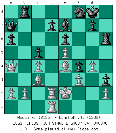 Last move : 1-0 2010 February 1 23:58:39 [Event "FICGS__CHESS__WCH_STAGE_2_GROUP_04__000006"] [Site "FICGS"] [Date "2009.11.03"] [Round "1"] [White "Wosch,Arkadiusz"] [Black "Lehnhoff,Heinz-Georg"] [Result "1-0"] [WhiteElo "2156"] [BlackElo "2238"] 1.e4 c5 2.Nf3 e6 3.d4 cxd4 4.Nxd4 Nc6 5.Nc3 Qc7 6.Be2 a6 7.O-O Nf6 8.Be3 Bb4 9.Na4 Be7 10.Nxc6 bxc6 11.Nb6 Rb8 12.Nxc8 Qxc8 13.Bd4 Qc7 14.e5 Nd5 15.c4 Nf4 16.g3 c5 17.Bc3 Nh3+ 18.Kg2 Ng5 19.Bd3 Qc6+ 20.f3 f6 21.Qe2 f5 22.Bc2 h5 23.Rad1 h4 24.Rd3 Nh7 25.Qd1 Nf8 26.g4 h3+ 27.Kh1 f4 28.Kg1 Rh4 29.Rd2 Qc7 30.Be4 Kf7 31.Qa4 Qa7 32.Kf2 Kg8 33.Ke2 Rh6 34.Rfd1 1-0 Sicilian : Taimanov (Bastrikov) variation Kingside Castling by player White (move 7) Player White won this chess game. Follow this game move after move (download)I love all positions. Give me a difficult positional game, I will play it. But totally won positions, I cannot stand them. (Hein Donner) Modernes Schach sorgt sich zuviel um Dinge wie Bauernstruktur usw. Vergessen Sie das, Schachmatt beendet das Spiel! (Nigel Short) Hay jugadores fuertes y personas amables y yo soy un jugador fuerte. (Bobby Fischer) Le temps de noter son nom sur la feuille de partie, j'étais déjà en zeitnot ! D'un modeste amateur apparié lors de la première ronde d'un open contre le grand-maître Azmaïparashvili. There is a computer disease that anybody who works with computers knows about. It's a very serious disease and it interferes completely with the work. The trouble with computers is that you 'play' with them ! (Richard P. Feynman)