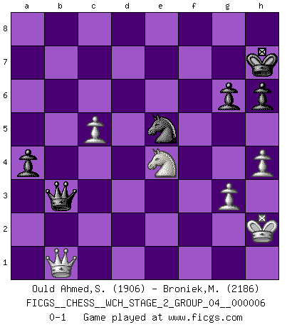 Last move : 0-1 2010 June 7 22:58:43 [Event "FICGS__CHESS__WCH_STAGE_2_GROUP_04__000006"] [Site "FICGS"] [Date "2009.11.03"] [Round "1"] [White "Ould Ahmed,Samy"] [Black "Broniek,Mariusz Maciej"] [Result "0-1"] [WhiteElo "1906"] [BlackElo "2186"] 1.e4 c5 2.Nf3 d6 3.d4 cxd4 4.Nxd4 Nf6 5.Nc3 a6 6.Bg5 e6 7.f4 Qb6 8.Qd2 Qxb2 9.Rb1 Qa3 10.e5 h6 11.Bh4 dxe5 12.fxe5 Nfd7 13.Ne4 Qxa2 14.Rd1 Qd5 15.Qe3 Qxe5 16.Be2 Bc5 17.Bg3 Qd5 18.c4 Bxd4 19.Rxd4 Qa5+ 20.Rd2 O-O 21.Bd6 Nc6 22.Bxf8 Nxf8 23.O-O e5 24.Nd6 f6 25.Bf3 Qc7 26.Bd5+ Be6 27.Qc5 Bxd5 28.Qxd5+ Kh7 29.Rb2 Rb8 30.c5 Ne7 31.Qd3+ Nfg6 32.Rc1 b5 33.h4 Kh8 34.g3 e4 35.Qxe4 Ne5 36.Kh1 Qd7 37.Kg2 a5 38.Ra1 N7c6 39.Rxb5 Rxb5 40.Nxb5 Qd2+ 41.Kf1 f5 42.Qxf5 Qd5 43.Qf8+ Kh7 44.Qf2 Ng4 45.Qc2+ Kh8 46.Kg1 Qf3 47.Ra3 Ne3 48.Rxe3 Qxe3+ 49.Kh2 Ne5 50.Nd6 Qf3 51.Qb1 a4 52.Qb8+ Kh7 53.Qb1+ g6 54.Ne4 Qb3 0-1 Sicilian : Najdorf, 7...Qb6 Kingside Castling by player Black (move 20) Kingside Castling by player White (move 23) Player Black won this chess game. Follow this game move after move (download)Robert Fischer is a law unto himself. (Larry Evans) Glücklicherweise sind Großmeister Ruben Fines reine Schachbücher weniger phallozentrisch [als seine Schachpsychologie] und deswegen auch weniger lächerlich. (Nigel Short) Coloca el contenido de las piezas del Ajedrez en un sombrero, agitalo vigorosamente, arrojalas en un tablero desde una altura de 30 centimetros y así obtendras el estilo de Steinitz. (H. E. Bird) Shah mat. Le roi est mort. Cri de fierté d'un joueur venant de terrasser son adversaire, courtoisement, sans effusion de sang. The worth of a book is to be measured by what you can carry away from it. (James Bryce)