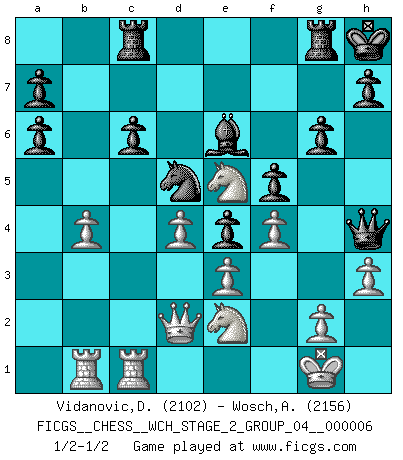 Last move : 1/2-1/2 2009 December 16 10:14:50 [Event "FICGS__CHESS__WCH_STAGE_2_GROUP_04__000006"] [Site "FICGS"] [Date "2009.11.03"] [Round "1"] [White "Vidanovic,Djordje"] [Black "Wosch,Arkadiusz"] [Result "1/2-1/2"] [WhiteElo "2102"] [BlackElo "2156"] 1.d4 Nf6 2.c4 e6 3.Nf3 d5 4.cxd5 exd5 5.Nc3 c6 6.Bf4 Nbd7 7.Qc2 Be7 8.h3 O-O 9.e3 Re8 10.Bd3 Nf8 11.O-O Ng6 12.Bg3 Bd6 13.Bxd6 Qxd6 14.Rab1 Bd7 15.b4 Qe7 16.a4 Rac8 17.a5 Ne4 18.Bxe4 dxe4 19.Nd2 f5 20.Rfe1 Be6 21.f4 Qd8 22.Ne2 Ne7 23.Nc4 Nd5 24.Rf1 g6 25.Rfc1 Kh8 26.Qd2 Rg8 27.Ne5 Qh4 28.a6 bxa6 1/2-1/2 Queen's pawn game Kingside Castling by player Black (move 8) Kingside Castling by player White (move 11) This chess game ended in a draw. Follow this game move after move (download)Let the perfectionist play postal. (Yasser Seirawan) Capablanka war das größte Genie der Schachgeschichte! Aber denken sie nicht er habe nichts vom Schach verstanden. Er wusste nur soviel wie er wissen musste um seine Ziele zu erreichen. (Mikhail Moiseyevich Botvinik) Del Ajedrez se ha dicho que la vida no es lo suficientemente larga para él, pero eso es culpa de la vida, no del Ajedrez. (William Ewart Napier) L'action d'une oeuvre littéraire se déroule sur un champ de bataille. Les masques et les types du drame moderne correspondent aux pièces du jeu d'échecs. L'intrigue correspond aux coups et aux gambits, c'est à dire aux techniques du jeu telles qu'utilisées et interprétées par les joueurs. Les tactiques et les péripéties [mouvements] correspondent aux coups exécutés par l'adversaire. (Viktor Shklovsky) A good aphorism is too hard for the tooth of time, and is not worn away with the centuries, although it serves as food for every speech. (Friedrich Nietzsche)