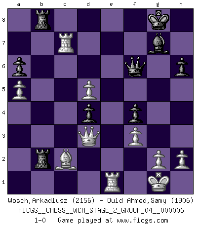Last move : 1-0 2010 April 8 21:11:57 [Event "FICGS__CHESS__WCH_STAGE_2_GROUP_04__000006"] [Site "FICGS"] [Date "2009.11.03"] [Round "1"] [White "Wosch,Arkadiusz"] [Black "Ould Ahmed,Samy"] [Result "1-0"] [WhiteElo "2156"] [BlackElo "1906"] 1.e4 c5 2.Nf3 d6 3.d4 cxd4 4.Nxd4 Nf6 5.Nc3 a6 6.Be2 e5 7.Nb3 Be7 8.O-O O-O 9.Be3 Be6 10.Qd2 Nbd7 11.a4 Rc8 12.a5 Qc7 13.Rfd1 Rfd8 14.Qe1 Qc6 15.Bf3 h6 16.Nc1 Qc7 17.N1e2 Bf8 18.Ng3 g6 19.Qe2 Qc4 20.Qd2 Kh7 21.Be2 Qc6 22.f3 Ng8 23.Rac1 Ne7 24.Nd5 Bxd5 25.exd5 Qc7 26.c4 f5 27.Nf1 Re8 28.b4 f4 29.Bf2 Nf5 30.Bd3 Qd8 31.Qe2 Nd4 32.Qa2 Qe7 33.Nd2 Qf7 34.Qb2 Nf5 35.Ne4 Bg7 36.c5 Nf6 37.b5 dxc5 38.bxa6 bxa6 39.Bxc5 Nxe4 40.Bxe4 Rb8 41.Qe2 Rb5 42.Bb6 Nd4 43.Qd3 Rb8 44.Rc7 Qf8 45.Bxg6+ Kh8 46.Qc4 Qf6 47.Bc2 Rb2 48.Bxd4 exd4 49.Qd3 Kg8 50.Re1 1-0 Sicilian : Najdorf, Opovcensky variation Kingside Castling by player White (move 8) Kingside Castling by player Black (move 8) Player White won this chess game. Follow this game move after move (download)Chess holds its master in its own bonds, shackling the mind and brain so that the inner freedom of the very strongest must suffer. (Albert Einstein) Ein Isolani verdüstert die Stimmung auf dem ganzen Schachbrett. (Savielly Grigorievitsch Tartakower) El Ajedrez es 99 por ciento táctica. (Teichmann) Vous n'êtes pas toujours obligé de jouer le meilleur coup. Un coup doit être actif, entreprenant, correct et beau ! (David Bronstein) Life is pain my dear and anyone who says otherwise is selling something. (Princess Bride)
