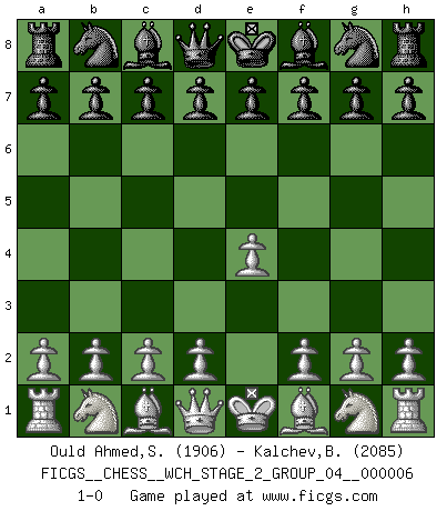 Last move : 1-0 2009 December 10 8:15:30 [Event "FICGS__CHESS__WCH_STAGE_2_GROUP_04__000006"] [Site "FICGS"] [Date "2009.11.03"] [Round "1"] [White "Ould Ahmed,Samy"] [Black "Kalchev,Borislav"] [Result "1-0"] [WhiteElo "1906"] [BlackElo "2085"] 1.e4 1-0 This chess game has been lost on time (started : 2009.11.03 19:55:28) King's pawn Opening Player White won this chess game. Follow this game move after move (download)Life is like a game of Chess, changing with each move. (Chinese proverb) Ich liebe den Moment, wenn ich das Ego meines Gegenüber breche. (Robert James Fischer) En el tablero, la mentira e hipocresía no sobreviven mucho. (Emanuel Lasker) Que feriez-vous si vous étiez en train de jouer aux échecs et que la fin du monde arrive ? Je continuerais à jouer. (Saint Borromée) Think like a man of action, act like a man of thought. (Henri Louis Bergson)