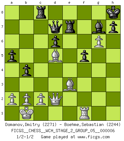 Last move : 1/2-1/2 2010 March 9 19:18:0 [Event "FICGS__CHESS__WCH_STAGE_2_GROUP_05__000006"] [Site "FICGS"] [Date "2009.11.03"] [Round "1"] [White "Domanov,Dmitry"] [Black "Boehme,Sebastian"] [Result "1/2-1/2"] [WhiteElo "2271"] [BlackElo "2244"] 1.e4 c5 2.Nf3 d6 3.d4 cxd4 4.Nxd4 Nf6 5.Nc3 a6 6.Be3 e5 7.Nb3 Be6 8.f3 Be7 9.Qd2 O-O 10.O-O-O Nbd7 11.g4 b5 12.Rg1 Qc7 13.g5 Nh5 14.Nd5 Bxd5 15.exd5 Nb6 16.Kb1 Rac8 17.Na5 Nxd5 18.Qxd5 Qxa5 19.Bd3 g6 20.Be4 Rb8 21.Qd3 Qc7 22.Rg4 Rbc8 23.Bd5 Qd7 24.h4 a5 25.Rg2 Rfe8 26.Qd2 b4 27.f4 exf4 28.Bxf4 Bf8 29.Rf1 Ng7 30.Be3 Re7 31.Rgf2 Nf5 32.Rxf5 gxf5 33.h5 Kh8 34.g6 fxg6 35.hxg6 Bg7 1/2-1/2 Sicilian : Najdorf, Byrne (English) attack Kingside Castling by player Black (move 9) Queenside Castling by player White (move 10) This chess game ended in a draw. Follow this game move after move (download)Some sacrifices are sound; the rest are mine. (Mikhail Tal) Strategie ist, wie man ein Mädchen auf den Rücksitz bekommt. Taktik ist, was man tut, wenn man dann dort ist. (Anonymous) Una buena memoria, concentración, imaginación y una fuerte voluntad, se requiere para llegar a ser un buen jugador. (Bobby Fischer) Il a essayé de se convaincre qu'il pourrait empêcher toutes les erreurs et ne jamais perdre. L'horreur ! Gary Kasparov au sujet de Robert Fischer. Wikichess, chess moves explained by 'experimented' players. (Thibault de Vassal)