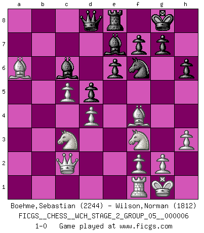 Last move : 1-0 2009 December 14 8:20:17 [Event "FICGS__CHESS__WCH_STAGE_2_GROUP_05__000006"] [Site "FICGS"] [Date "2009.11.03"] [Round "1"] [White "Boehme,Sebastian"] [Black "Wilson,Norman"] [Result "1-0"] [WhiteElo "2244"] [BlackElo "1812"] 1.e4 Nc6 2.d4 e6 3.Nf3 Nf6 4.e5 Nd5 5.c4 Nb6 6.Nc3 d6 7.exd6 cxd6 8.Be2 Be7 9.O-O O-O 10.Be3 d5 11.c5 Nd7 12.a3 h6 13.b4 a6 14.Qc2 Nf6 15.h3 b6 16.Bf4 b5 17.a4 bxa4 18.Rxa4 Re8 19.b5 Bb7 20.bxc6 Bxc6 21.Rxa6 Rxa6 22.Bxa6 1-0 KP : Nimzovich defense Kingside Castling by player White (move 9) Kingside Castling by player Black (move 9) Player White won this chess game. Follow this game move after move (download)Daring ideas are like Chess men moved forward. They may be beaten, but they may start a winning game. (Johann Wolfgang von Goethe) Schach ist Krieg, im Schach geht es um testosterongesteuerte Urschreie. (Garry Kasparov) En el Ajedrez, cuando menos, el valiente hereda la tierra. (Edmar Mednis) Les Echecs ne sont pas pour les âmes timides. Ils requièrent un homme entier, qui ne s'arrête pas aveuglément à ce qui a été déjà établi, mais qui tente individuellement de sonder les profondeurs du jeu. (W. Steinitz) Shallow men believe in luck. Strong men belive in cause and effect. (Ralph Waldo Emerson)
