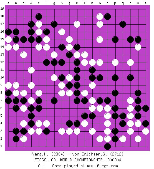 Last move : 0-1 2010 July 13 21:27:31 [Event "FICGS__GO__WORLD_CHAMPIONSHIP__000004 "] [Site "FICGS"] [Date "2009.11.03"] [Round "4"] [Black "Yang,Huayong "] [White "von Erichsen,Svante Carl "] [Result "0-1"] [Rating 1 "2334"] [Rating 2 "2712"] 1.q17 r4 2.d16 c4 3.r15 k17 4.p3 m3 5.p6 r6 6.q5 r5 7.f3 h3 8.c3 d3 9.d4 c2 10.b3 e4 11.d5 e3 12.b2 d7 13.e6 f4 14.e7 d9 15.c7 c8 16.b7 e8 17.g17 n17 18.r10 o5 19.q4 r3 20.p8 r12 21.m5 l4 22.c15 p12 23.p10 n12 24.n10 c13 25.p15 n15 26.g7 e17 27.d17 f15 28.f16 e16 29.e15 e14 30.d15 h16 31.e18 f14 32.m11 m12 33.k11 l12 34.j4 j3 35.k4 k3 36.l5 j10 37.k10 h8 38.k12 k13 39.j9 h9 40.h10 j8 41.k9 g10 42.j13 j14 43.k14 l13 44.h12 c6 45.b6 b8 46.d6 b14 47.b15 o3 48.p2 o2 49.s7 r7 50.s8 q2 51.o1 n2 52.t4 t5 53.s5 s4 54.t6 t3 55.s6 s2 56.o18 n18 57.a8 a9 58.a7 b9 59.h14 j15 60.f12 g13 61.g12 a15 62.a16 a14 63.b16 o6 64.o7 m7 65.l7 l8 66.k8 n6 67.n7 m6 68.k7 m9 69.m10 s14 70.s15 d11 71.p5 o4 0-1 This go game has been lost on time (started : 2009.11.03 20:5:56)Thibault de Vassal Finally the clock decided the result... what do you think about the position?Huayong Yang Thank you for watching and thank Svante Carl for the game. Sorry about the timeout (I just got back from a vacation). Black was behind, I think.Thibault de Vassal "Fortunately" then...Svante Carl von Erichsen Thank you, Huayong. I think that Black lost some points in the centre, but White was behind before. It might be pretty close, but I cannot read out the end game completely.Thibault de Vassal Interesting discussion on the game in the lifein19x19 forum :) http://lifein19x19.com/forum/viewtopic.php?f=15&t=1097 Here are the names of the openings (joseki) played in the four corners : Corner q4 : r4 p3Komoku (Somok, Xiao~mu`) 3-4 Point. The komoku (3-4) point is the traditional corner enclosure move..Ikken Kakari (Hankan Keolch'im, Yi Gua`jiao~, 1-Space Low Pincer). The small knight move is the basic approach move to the 3-4 point stone. It has been continually used for over four centuries. There are limitless variations, with new moves constantly being discovered. Black 2 opens the door to a treaure store of joseki. Corner d4 : c4 f3Komoku (Somok, Xiao~mu`) 3-4 Point. The komoku (3-4) point is the traditional corner enclosure move..Niken Kakari (Dukan Keolch'im, E`r Gua`jiao~, 2-Space Low Approach). Black 2 is used with friendly forces backing it up. Its purpose is to prevent a pincer. Locally it results in a loss, but may be appropriate fuseki strategy. It was popular in the late 1950s and early 1960s, but is not seen often nowadays, having been replaced by the one-space high approach, with which it has points in common. Player White won this Go (weiqi, baduk) game.Follow this game move after move (download ) White is always trying to kill a bigger group than black is trying to save. (Anonymous) Always two there are. No more no less. A master, and an apprentice. (Master Yoda in Star Wars ep.1)