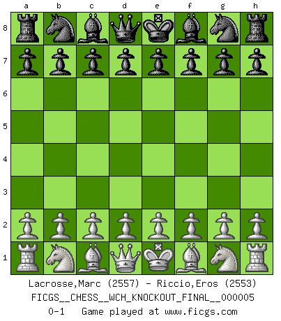 Last move : 0-1 2009 November 3 20:14:25 [Event "FICGS__CHESS__WCH_KNOCKOUT_FINAL__000005"] [Site "FICGS"] [Date "2009.11.03"] [Round "3"] [White "Lacrosse,Marc"] [Black "Riccio,Eros"] [Result "0-1"] [WhiteElo "2557"] [BlackElo "2553"] 0-1 Player Black won this chess game. Follow this game move after move (download)All my games are real. (Bobby Fischer) Ein Springer auf f6 gegen die eigene Rochadestellung ist schlimmer als ein rostiger Nagel im Knie. (Efim Bogoljubov) Fischer sacrificó virtualmente todo lo que la mayoría de nosotros los 'debiles' (término que él usa) valoramos, respetamos y apreciamos por el amor de un astuto, a menudo hermoso tablero de juego, por el privilegio ambivalente de ser su mas grande maestro. (Paul Kollar) On entre au jeu d'Echecs comme on entre en Religion. Pour le joueur d'Echecs, la partie d'Echecs c'est l'office, la messe, le défilé du 1er Mai, le dépôt de gerbe au Monument aux Morts. C'est un drame sacré. (Michel Roos) Methinks King Thibault should dub Marius Zubac a knight of the square board... I mean table, henceforth addressing him as Sir Marius, and bestow on him a suitable land from the kingdom of FICGS & marry him off to a worthy, fair maiden, lest he slice our heads with his mighty sword in his wrath. (Dinesh De Silva)