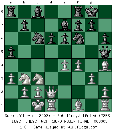 Last move : 1-0 2009 December 23 21:44:25 [Event "FICGS__CHESS__WCH_ROUND_ROBIN_FINAL__000005"] [Site "FICGS"] [Date "2009.11.03"] [Round "1"] [White "Gueci,Alberto"] [Black "Schiller,Wilfried"] [Result "1-0"] [WhiteElo "2402"] [BlackElo "2353"] 1.e4 c5 2.Nf3 Nc6 3.d4 cxd4 4.Nxd4 Nf6 5.Nc3 d6 6.Bg5 e6 7.Qd2 Be7 8.O-O-O O-O 9.f4 h6 10.Bh4 Qa5 11.Nb3 Qh5 12.g3 a5 13.a3 1-0 Sicilian defense Queenside Castling by player White (move 8) Kingside Castling by player Black (move 8) Player White won this chess game. Follow this game move after move (download)I'd rather have a Pawn than a finger. (Reuben Fine) Nie in meinem Leben habe ich die französische Verteidigung gespielt, welche die Stumpfsinnigste von allen ist. (Wilhelm Steinitz) Yo siempre he tenido un ligero sentimiento de lástima por una persona que no tiene conocimiento del Ajedrez. (Siegbert Tarrasch) Avec des compensations pour le matériel en plus... (Anonyme) Being number two sucks. (Andre Agassi)