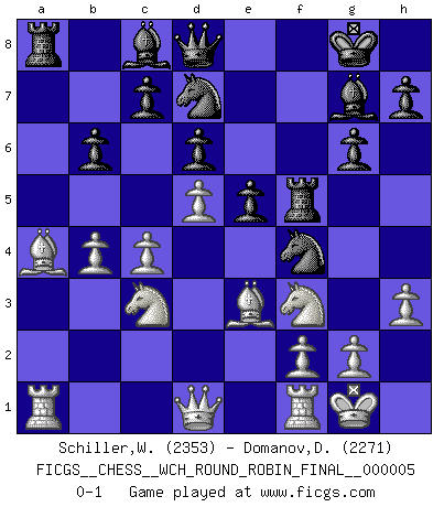 Last move : 0-1 2009 December 25 7:24:12 [Event "FICGS__CHESS__WCH_ROUND_ROBIN_FINAL__000005"] [Site "FICGS"] [Date "2009.11.03"] [Round "1"] [White "Schiller,Wilfried"] [Black "Domanov,Dmitry"] [Result "0-1"] [WhiteElo "2353"] [BlackElo "2271"] 1.d4 Nf6 2.c4 g6 3.Nf3 Bg7 4.Nc3 O-O 5.e4 d6 6.h3 e5 7.d5 a5 8.Bd3 Na6 9.O-O Nc5 10.Bc2 b6 11.Be3 Nh5 12.a3 Nf4 13.b4 Nd7 14.Ba4 axb4 15.axb4 f5 16.exf5 Rxf5 0-1 King's Indian, 3.Nf3 Kingside Castling by player Black (move 4) Kingside Castling by player White (move 9) Player Black won this chess game. Follow this game move after move (download)When I have White, I win because I am white; When I have Black, I win because I am Bogolyubov. (Bogolyubov) Schach sollte überall auf der Welt Schulfach werden. Es fördert die geistige Auseinandersetzung. Es lehrt die Demut in der Niederlage. (Garry Kasparov) El Ajedrez es parte de la cultura, y si una cultura esta en decadencia, entonces también el Ajedrez declinará. (Mikhail Botvinnik) Les Echecs sont affaire de jugement sensible. Savoir quand frapper et quand esquiver. (Fischer) Drag your thoughts away from your troubles... by the ears, by the heels, or any other way you can manage it. (Mark Twain)
