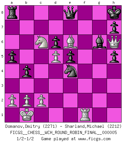Last move : 1/2-1/2 2010 February 28 0:37:18 [Event "FICGS__CHESS__WCH_ROUND_ROBIN_FINAL__000005"] [Site "FICGS"] [Date "2009.11.03"] [Round "1"] [White "Domanov,Dmitry"] [Black "Sharland,Michael"] [Result "1/2-1/2"] [WhiteElo "2271"] [BlackElo "2212"] 1.e4 c5 2.Nf3 d6 3.d4 cxd4 4.Nxd4 Nf6 5.Nc3 a6 6.Be3 e5 7.Nb3 Be6 8.f3 Be7 9.Qd2 O-O 10.O-O-O Nbd7 11.g4 b5 12.g5 Nh5 13.Kb1 Nb6 14.Nd5 Nxd5 15.exd5 Bf5 16.Na5 f6 17.h4 Qe8 18.Rh2 Bg6 19.Bh3 fxg5 20.hxg5 Rxf3 21.Re1 Rxe3 22.Qxe3 Qd8 23.Be6+ Kh8 24.Nc6 Bxg5 25.Qe2 Qe8 26.Qg4 Bf4 27.Rh3 Nf6 28.Qg2 Bh6 29.Rxh6 gxh6 30.Rf1 Ne4 31.Qe2 h5 32.Qe3 b4 33.Qh6 a5 1/2-1/2 Sicilian : Najdorf, Byrne (English) attack Kingside Castling by player Black (move 9) Queenside Castling by player White (move 10) This chess game ended in a draw. Follow this game move after move (download)I have always a slight feeling of pity for the man who has no knowledge of Chess. (Siegbert Tarrasch) Herr Iljumschinow ist ein etwas merkwürdiger Geschäftsmann: Er arbeitet zusammen mit Leuten wie Muammar al-Gaddafi; früher ist das Saddam Hussein gewesen. (Joel Lautier) Todo se encuentra en un estado de flujo y esto incluye al mundo del Ajedrez. (Mikhail Botvinnik) Il (Jacob Murray) ne joue pas pour le bon coup, mais pour le meilleur. (Eloi Relange) The intuitive mind is a sacred gift; the rational mind is a faithful servant. We have created a society that honors the servant but has forgotten the gift. (Albert Einstein)