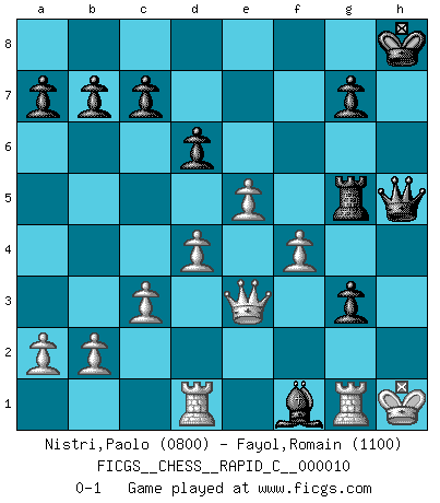 Last move : 0-1 2006 November 13 8:41:56 [Event "FICGS__CHESS__RAPID_C__000010"] [Site "FICGS"] [Date "2006.10.02"] [Round "1"] [White "Nistri,Paolo"] [Black "Fayol,Romain"] [Result "0-1"] [WhiteElo "0800"] [BlackElo "1100"] 1.e4 e5 2.Nf3 Nc6 3.Nc3 Nf6 4.Bb5 d6 5.O-O Be7 6.d3 O-O 7.Bg5 h6 8.Be3 Ng4 9.Nd5 f5 10.Nxe7+ Qxe7 11.Qe2 f4 12.Bd2 Nd4 13.Bc4+ Kh8 14.Nxd4 exd4 15.f3 Ne3 16.Bxe3 dxe3 17.Rad1 Qf6 18.c3 Bd7 19.d4 Rae8 20.e5 Qe7 21.Bb3 Rf5 22.Bc2 Rh5 23.Bg6 Rg5 24.Bxe8 Bh3 25.g4 Qxe8 26.Rfe1 h5 27.Kh1 hxg4 28.Rg1 g3 29.hxg3 fxg3 30.Qxe3 Qh5 31.f4 Bf1 0-1 Four knights : Spanish variation Kingside Castling by player White (move 5) Kingside Castling by player Black (move 6) Player Black won this chess game. Follow this game move after move (download)The winner of the game is the player who makes the next-to-last mistake. (Savielly Tartakover) Wie gewinnt Tal? Er entwickelt alle seine Figuren in die Brettmitte und opfert sie dann irgendwo. (Robert James Fischer) No volvere nunca a jugar contigo. Has insultado a mi amigo. - cuando un oponente se maldijo por una mala jugada (Miguel Najdorf) Lorsque vous vous retrouvez devant une position atroce, ne tendez pas un ultime piège dérisoire avec l'intention d'abandonner si l'adversaire le déjoue ! Faites-vous plutôt un devoir de résister comme si votre vie en dépendait. Jouez le coup qui vous déplairait au centuple si vous étiez dans la peau de votre tortionnaire ! It's not a bug - it's an undocumented feature. (Anonymous)