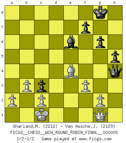 Last move : 1/2-1/2 2010 January 14 22:40:12 [Event "FICGS__CHESS__WCH_ROUND_ROBIN_FINAL__000005"] [Site "FICGS"] [Date "2009.11.03"] [Round "1"] [White "Sharland,Michael"] [Black "Van Assche,Jeroen"] [Result "1/2-1/2"] [WhiteElo "2212"] [BlackElo "2129"] 1.e4 c5 2.Nf3 d6 3.d4 cxd4 4.Nxd4 Nf6 5.Nc3 g6 6.Be3 Bg7 7.f3 Nc6 8.Qd2 O-O 9.O-O-O d5 10.exd5 Nxd5 11.Nxc6 bxc6 12.Bd4 Nxc3 13.Qxc3 Bh6+ 14.Be3 Bxe3+ 15.Qxe3 Qb6 16.Qxe7 Be6 17.Qa3 Rad8 18.Re1 Rd4 19.h4 h5 20.Bd3 c5 21.Re4 Rxe4 22.Bxe4 c4 23.Rd1 Rd8 24.Rxd8+ Qxd8 25.Qxa7 Qxh4 26.Qg1 c3 27.b3 1/2-1/2 Sicilian : Dragon, Yugoslav attack Kingside Castling by player Black (move 8) Queenside Castling by player White (move 9) This chess game ended in a draw. Follow this game move after move (download)The way he plays Chess demonstrates a man's whole nature. (Stanley Ellin) Schach ist eine Sache der genauen Beurteilung, wann man zuschlagen und wann man sich ducken muss. (Robert James Fischer) Fischer no está bajo la obligación de nadie. (Joseph Platz) Les échecs sont un jeu terrible. Si vous n'avez pas le centre, votre adversaire a une position plus libre. Par contre, si vous avez le centre, alors vous avez vraiment quelque chose pour laquelle vous inquiéter ! (Siegbert Tarrasch) Wisdom doesn't necessarily come with age. Sometimes age just shows up all by itself. (Tom Wilson)