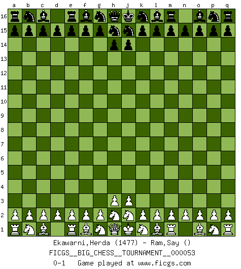 Last move : 0-1 2009 December 4 8:56:40 [Event "FICGS__BIG_CHESS__TOURNAMENT__000053"] [Site "FICGS"] [Date "2009.11.04"] [Round "1"] [White "Ekawarni,Herda"] [Black "Ram,Say"] [Result "0-1"] [WhiteElo "1477"] [BlackElo ""] 0-1 This big chess game has been lost on time (started : 2009.11.04 5:40:36) Follow this game move after move (download)A thorough understanding of the typical mating continuations makes the most complicated sacrificial combinations leading up to them not only not difficult, but almost a matter of course. (Siegbert Tarrasch) Gewinnen beim Schach fördert das Selbstvertrauen. Beim Sex spüre ich sowas nicht... (Garry Kasparov) Si pudieramos observar el interior de la cabeza de un jugador de Ajedrez, encontraríamos ahí un mundo lleno de sentimientos, imágenes, ideas, emoción y pasión. (Alfred Binet) Le thème de l'attaque double intervient d'une manière ou d'une autre dans l'immense majorité des combinaisons. (Youri Averbakh) Unless in communicating with it one says exactly what one means, trouble is bound to result. (Alan Turing, about computers)