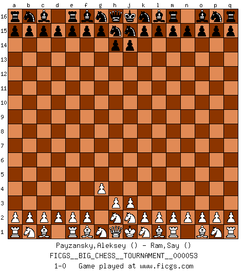 Last move : 1-0 2009 December 4 8:56:40 [Event "FICGS__BIG_CHESS__TOURNAMENT__000053"] [Site "FICGS"] [Date "2009.11.04"] [Round "1"] [White "Payzansky,Aleksey"] [Black "Ram,Say"] [Result "1-0"] [WhiteElo ""] [BlackElo ""] 1.g2-g4 1-0 This big chess game has been lost on time (started : 2009.11.04 5:40:36) Follow this game move after move (download)All my games are real. (Bobby Fischer) Heutzutage gewinnt im Turnier nicht derjenige Spieler, der weitreichende Pläne entwirft, sondern einfach jener, der Zug um Zug kämpft. (David Bronstein) Ciertamente el estado mental actual de Bobby Fischer es una tragedia. Uno de los mas grandes jugadores de Ajedrez del mundo -el orgullo y pena del Ajedrez Americano. (Frank Brady) Les échecs, c'est la lutte contre l'erreur. (Johannes Zukertort) A shortcut is the longest distance between two points. (Don Groves)