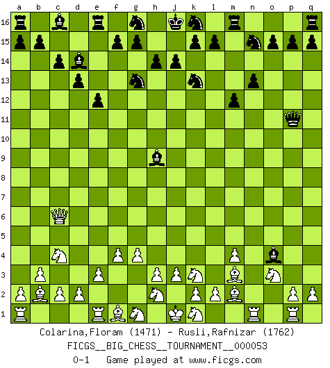Last move : 0-1 2010 February 8 8:24:56 [Event "FICGS__BIG_CHESS__TOURNAMENT__000053"] [Site "FICGS"] [Date "2009.11.04"] [Round "1"] [White "Colarina,Floram"] [Black "Rusli,Rafnizar"] [Result "0-1"] [WhiteElo "1471"] [BlackElo "1762"] 1.j2-h4 h15-g13 2.g2-g4 j15-k13 3.o2-o4 e15-e13 4.n2-n4 m15-m13 5.p1-o3 n15-n13 6.m2-m4 d15-d13 7.b2-b3 h16-n11 8.o1-m3 o16-e7 9.h4-k3 f16-d14 10.c1-b2 m13-m12 11.b1-a3 c15-c14 12.a3-c4 l16-n14 13.e2-e3 p16-n15 14.l1-m2 b16-a14 15.h1-e4 e7-h10 16.e4-c6 n14-h9 17.m3-a14 n11-n4 18.a14-m3 n4-n9 19.f2-f4 e13-e12 20.m1-n1 n9-p11 21.q1-p1 h10-o4 0-1 This big chess game has been lost on time (started : 2009.11.04 5:40:36) Follow this game move after move (download)In Chess, at least, the brave inherit the earth. (Edmar Mednis) Ein bischen Romantik kann weder im Schach noch in der Liebe schaden. Also versuche ich mich ab und zu daran zu erinnern. (Nigel Short) Una buena ofensiva y una buena defensa, comienzan ambas con un buen desarrollo. (Bruce A. Moon) Le génie consiste à savoir transgresser les règles au moment opportun. (Teichmann) Once you start thinking you have nothing left to learn, you have everything to learn. (Steve Badget)