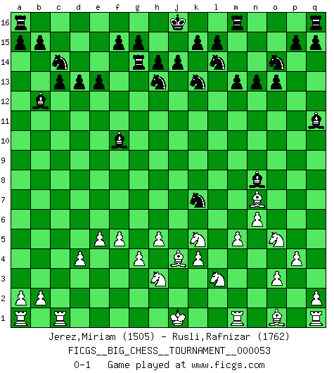 Last move : 0-1 2010 April 8 20:45:22 [Event "FICGS__BIG_CHESS__TOURNAMENT__000053"] [Site "FICGS"] [Date "2009.11.04"] [Round "1"] [White "Jerez,Miriam"] [Black "Rusli,Rafnizar"] [Result "0-1"] [WhiteElo "1505"] [BlackElo "1762"] 1.g2-g4 j15-k13 2.o2-o3 h16-o10 3.h3-h4 o10-c10 4.k2-k3 c10-c2 5.b1-c3 c2-l10 6.k1-l3 e15-e13 7.d2-d3 m15-m13 8.e2-e4 d15-d13 9.m2-m4 n15-n13 10.l1-p5 o16-f8 11.k3-k4 l10-p6 12.p5-o4 p6-l2 13.h2-k3 l2-k3 14.f1-j4 k3-j3 15.h1-h3 j3-h3 16.g1-h3 l16-p12 17.f2-f3 c16-n6 18.n2-n4 f16-b12 19.m4-m5 n6-l8 20.p1-n2 c15-c13 21.o4-m6 o15-o13 22.h4-h5 b16-c14 23.c1-l9 p16-o14 24.f3-f4 k16-l14 25.f4-f5 g16-f14 26.n2-m4 h15-j13 27.l3-k5 l8-m7 28.d3-d4 p12-q11 29.c3-d5 j13-k11 30.n4-n5 k11-l9 31.n5-n6 m7-n8 32.j2-l3 l9-k7 33.m6-n7 f14-h13 34.d5-c7 f8-d6 35.e4-e5 d6-c7 36.e1-c1 c7-f10 37.m4-o5 e16-e14 38.p2-p4 e14-g14 0-1 This big chess game has been lost on time (started : 2009.11.04 5:40:36) Follow this game move after move (download)When you play Bobby, it is not a question if you win or lose. It is a question if you survive. (Boris Spassky) Es gibt zwei Arten von Opfern: Korrekte und meine. (Mikhail Nekhemyevich Tal) Todos los jugadores de Ajedrez deberían tener un pasatiempo. (Savielly Tartakower) Il (Jacob Murray) ne joue pas pour le bon coup, mais pour le meilleur. (Eloi Relange) If you don't practice you don't deserve to win. (Andre Agassi)
