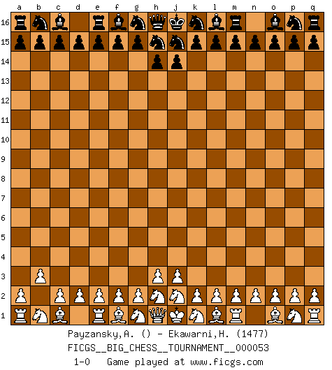 Last move : 1-0 2009 December 4 8:56:40 [Event "FICGS__BIG_CHESS__TOURNAMENT__000053"] [Site "FICGS"] [Date "2009.11.04"] [Round "1"] [White "Payzansky,Aleksey"] [Black "Ekawarni,Herda"] [Result "1-0"] [WhiteElo ""] [BlackElo "1477"] 1.b2-b3 1-0 This big chess game has been lost on time (started : 2009.11.04 5:40:36) Follow this game move after move (download)The tactician must know what to do whenever something needs doing; the strategist must know what to do when nothing needs doing. (Savielly Tartakover) Sie führen leise Selbstgespräche, schlürfen lautstark ihre Getränke, schmatzen hörbar beim Essen, blasen ihrem Gegenüber Rauch in die Augen, niesen ihm ins Gesicht, starren ihn unverwandt an, bis er sich unter ihren Blicken windet, rutschen ständig auf ihrem Stuhl hin und her, rülpsen und bohren in der Nase. (Anonymous) Tu no necesitas jugar muy bien, únicamente ayudar a tu oponenet a que juegue muy mal. (Genrikh Chepukaitis) Les Echecs mettent en conflit, non pas deux intelligences, mais deux volontés. (Lasker) Work expands to fill the time available. (C. Northcote Parkinson, in Parkinson's Laws)