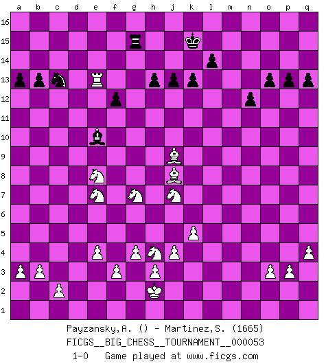 Last move : 1-0 2010 April 10 8:48:21 [Event "FICGS__BIG_CHESS__TOURNAMENT__000053"] [Site "FICGS"] [Date "2009.11.04"] [Round "1"] [White "Payzansky,Aleksey"] [Black "Martinez,Silvio"] [Result "1-0"] [WhiteElo ""] [BlackElo "1665"] 1.p2-p3 g15-g13 2.o1-p2 c15-c14 3.p1-q3 j15-k13 4.b2-b3 h16-o10 5.j2-g3 d15-d13 6.q3-o4 o10-l10 7.e2-e4 l10-l2 8.k1-l3 l2-c10 9.f1-c4 o15-o14 10.h1-o7 h14-h13 11.b1-c3 n15-n13 12.c1-b2 e15-e13 13.m2-m3 p16-n15 14.o4-p6 m15-m13 15.l1-p5 f16-e15 16.q2-q4 b16-d15 17.e1-e3 e15-c13 18.n2-n3 b15-b13 19.p5-g13 n15-l14 20.e3-f3 h15-g13 21.g1-e2 l16-p12 22.a2-a3 f15-f13 23.f3-f7 c16-a14 24.o7-p7 q15-q13 25.p7-g15 e16-e15 26.g15-g13 g16-h14 27.c3-b5 a16-g16 28.g13-a7 a14-c16 29.f7-c7 c10-l2 30.q1-o1 a15-a14 31.c7-c13 d15-c13 32.a7-c9 o16-g9 33.j3-j4 c13-d11 34.c9-c14 d11-b12 35.c14-c9 b12-d11 36.c9-a11 g9-n3 37.a11-e15 n3-l1 38.m1-l1 l2-m3 39.p2-d13 g16-h16 40.d13-n4 m3-m10 41.l1-m1 m10-d2 42.b5-d4 d2-j7 43.c4-m13 k16-h15 44.g3-h5 j7-d2 45.e15-d14 p12-j6 46.l3-k5 d2-g5 47.e2-g3 g5-d8 48.m13-p10 h14-f15 49.d14-g14 f15-h14 50.g14-g6 d8-g8 51.g6-g8 j6-g8 52.h5-j7 g8-h7 53.d4-f5 m16-m1 54.o1-m1 f13-f12 55.a1-d1 c16-p4 56.o2-o3 p4-n6 57.m1-m6 n6-p8 58.p6-n7 p8-n10 59.f2-f3 h16-g16 60.h2-g4 h14-j12 61.j1-h2 k15-k14 62.p10-l14 j16-j15 63.g4-f6 h7-j6 64.k5-h4 j6-f9 65.f5-e7 f9-e10 66.n4-b15 k13-m12 67.l14-n12 g16-g15 68.b15-j8 j12-l11 69.n12-m11 n10-m11 70.j8-m11 k14-k13 71.f6-e8 n13-n12 72.b2-l11 j14-j13 73.l11-m12 j15-j14 74.m11-j8 q16-m16 75.m12-j9 m16-m6 76.j9-m6 o14-o13 77.n7-l8 l15-l14 78.g3-f5 a14-a13 79.g2-g4 h15-g13 80.f5-g7 p15-p13 81.k2-k4 g13-h11 82.k4-k5 d11-e9 83.d1-d14 j14-k15 84.d14-e14 e9-d11 85.l8-j9 h11-j9 86.m6-j9 d11-c13 87.e14-e13 1-0 This big chess game has been lost on time (started : 2009.11.04 5:40:36) Follow this game move after move (download)Chess is imagination. (David Bronstein) Sicherlich können nur Meister einen Stil haben. Daß ein nicht-Meister auch nur ein einziges Mal in seinem Leben eine Partie folgerecht durchführte, habe ich niemals bemerkt. (Emanuel Lasker) El muchacho (en ese entonces un niño de 12 años llamado Anatoly Karpov) no tiene ni idea de lo que es el Ajedrez y no hay futuro en absoluto para el en esta profesión. (Mikhail Botvinnik) On est toujours la mazette de quelqu'un d'autre. (Anonyme) Always two there are. No more no less. A master, and an apprentice. (Master Yoda in Star Wars ep.1)