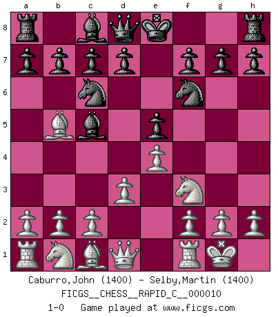 Last move : 1-0 2006 December 4 5:0:40 [Event "FICGS__CHESS__RAPID_C__000010"] [Site "FICGS"] [Date "2006.10.02"] [Round "1"] [White "Caburro,John"] [Black "Selby,Martin"] [Result "1-0"] [WhiteElo "1400"] [BlackElo "1400"] 1.e4 e5 2.Nf3 Nc6 3.Bb5 Nf6 4.d3 Bc5 5.O-O 1-0 Ruy Lopez : Berlin defense Kingside Castling by player White (move 5) Player White won this chess game. Follow this game move after move (download)Chess is thirty to forty percent psychology. You don't have this when you play a computer. I can't confuse it. (Judith Polgar) Das Blackmar-Diemer-Gambit verändert den ganzen Menschen! (Emil Joseph Diemer) Yo considero que Fischer es uno de los expertos mas grandes de aperturas de siempre. (Keith Hayward) À la honte des hommes, on sait que les lois du jeu sont les seules qui soient partout justes, claires, inviolables et exécutées. Pourquoi l'Indien qui a donné les règles du jeu d'échecs est-il obéi de bon gré dans toute la terre, et que les décrétales des papes, par exemple, sont aujourd'hui un objet d'horreur et de mépris ? C'est que l'inventeur des échecs combina tout avec justesse pour la satisfaction des joueurs, et que les papes, dans leurs décrétales, n'eurent en vue que leur seul avantage. L'Indien voulut exercer également l'esprit des hommes et leur donner du plaisir; les papes ont voulu abrutir l'esprit des hommes. Voltaire (Dictionnaire philosophique / Garnier 1967) Animated gif is worth one mega-word. (Unknown)