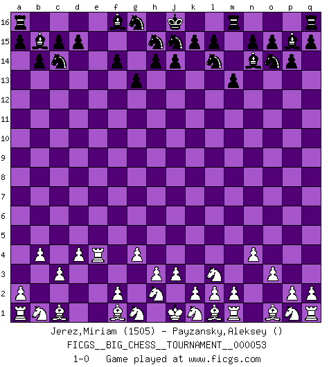 Last move : 1-0 2009 November 19 6:42:50 [Event "FICGS__BIG_CHESS__TOURNAMENT__000053"] [Site "FICGS"] [Date "2009.11.04"] [Round "1"] [White "Jerez,Miriam"] [Black "Payzansky,Aleksey"] [Result "1-0"] [WhiteElo "1505"] [BlackElo ""] 1.g2-g4 b15-b14 2.c2-c3 c16-b15 3.o2-o3 p15-p14 4.j2-l3 k16-l14 5.h1-o7 p16-o14 6.o7-f15 b16-c14 7.f15-f7 m15-m13 8.d2-d4 l16-n14 9.f7-f5 g15-g13 10.n2-n4 h16-f14 11.f5-f14 e15-f14 12.b2-b4 o16-p15 13.e2-e4 e16-e4 14.e1-e4 1-0 Follow this game move after move (download)My God, Bobby Fischer plays so simply. (Alexei Suetin) Die starken Figuren des Gegners muss man abtauschen. (José Raúl Capablanca) La última cosa en que Fischer estaba interesado era en tonterías, siempre y cuando el Ajedrez estuviera involucrado. (Elie Agur) Dieu déplace le joueur, et celui-ci la pièce. Quel Dieu derrière Dieu commence donc la trame ? Arturo Perez-Reverte (prix de littérature policière 1993). Kids, you tried your best and you failed miserably. The lesson is, never try. (Simpsons)