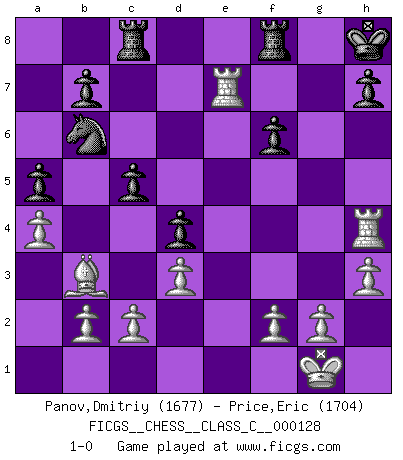 Last move : 1-0 2009 November 15 14:39:35 [Event "FICGS__CHESS__CLASS_C__000128"] [Site "FICGS"] [Date "2009.11.04"] [Round "1"] [White "Panov,Dmitriy"] [Black "Price,Eric"] [Result "1-0"] [WhiteElo "1677"] [BlackElo "1704"] 1.e4 e5 2.Nf3 Nc6 3.Bc4 Nf6 4.d3 d5 5.exd5 Nxd5 6.O-O Nb6 7.Bb3 Be7 8.Re1 Bg4 9.h3 Bxf3 10.Qxf3 O-O 11.Be3 Bd6 12.Nd2 a5 13.a4 Ra6 14.Ne4 Nd4 15.Bxd4 exd4 16.Nxd6 Qxd6 17.Re8 Ra8 18.Qxf7+ Kh8 19.Rae1 Qf6 20.Qxf6 gxf6 21.R8e7 Rac8 22.R1e4 c5 23.Rh4 1-0 Two knights defense (Modern Bishop's Opening) Kingside Castling by player White (move 6) Kingside Castling by player Black (move 10) Player White won this chess game. Follow this game move after move (download)A man without frontiers. He didn't divide the East and the West, he brought them together in their admiration for him. (Ljubomir Ljubojevic, about Bobby Fischer's death) Ja, ich habe einmal eine Blitzpartie gespielt, es war in einem Zug, 1929. --im Interview 1989 (Mikhail Moiseyevich Botvinik) El tablero es el mundo, las piezas es el fenomeno del universo, las reglas del juego son lo que llamamos leyes de la naturaleza y el jugador del lado opuesto, se encuentra oculto a nuestra vista. (Thomas Huxley) Les échecs, c'est la lutte contre l'erreur. (Johannes Zukertort) Life is painting a picture, not doing a sum. (Oliver Wendell Holmes, Jr.)