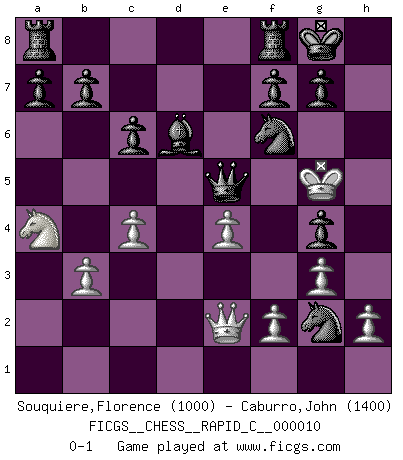 Last move : 0-1 2006 October 12 7:39:42 [Event "FICGS__CHESS__RAPID_C__000010"] [Site "FICGS"] [Date "2006.10.02"] [Round "1"] [White "Souquiere,Florence"] [Black "Caburro,John"] [Result "0-1"] [WhiteElo "1000"] [BlackElo "1400"] 1.e4 c6 2.Bc4 d5 3.Nc3 dxc4 4.b4 cxb3 5.axb3 e5 6.Nf3 Bd6 7.Ra5 Qxa5 8.O-O Nf6 9.Na4 O-O 10.Ng5 h6 11.Bb2 hxg5 12.d3 Na6 13.Bc3 Bb4 14.Bxe5 Qxe5 15.Qb1 Bd6 16.g3 Bh3 17.c4 Bxf1 18.Qxf1 Nc5 19.Qe1 Nxd3 20.Qe2 Qa1+ 21.Kg2 Ne1+ 22.Kh3 g4+ 23.Kh4 Ng2+ 24.Kg5 Qe5+ 0-1 Caro-Kann : Hillbilly attack Kingside Castling by player White (move 8) Kingside Castling by player Black (move 9) Player Black won this chess game. Follow this game move after move (download)The defensive power of a pinned piece is only imaginary. (Aaron Nimzovich) Der Schachmeister von Heute braucht Courage, einen Killerinstinkt, Ausdauer und Arroganz. (Larry Evans) Por la belleza de sus partidas, la claridad de su juego y lo brillante de sus ideas, Fischer se creó el mismo como un artista de la misma estatura como Brahms, Rembrandt y Shakespeare. (David Levy) Ce n'est pas pour s'amuser qu'il joue aux échecs : il célèbre un culte. (Vladimir Nabokov) Rules and bones are meant to be broken. (Anonymous)