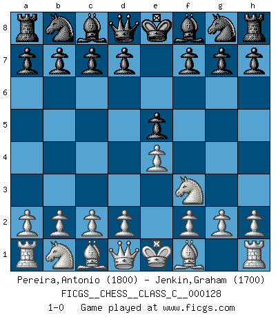 Last move : 1-0 2009 December 20 19:54:37 [Event "FICGS__CHESS__CLASS_C__000128"] [Site "FICGS"] [Date "2009.11.04"] [Round "1"] [White "Pereira,Antonio"] [Black "Jenkin,Graham"] [Result "1-0"] [WhiteElo "1800"] [BlackElo "1700"] 1.e4 e5 2.Nf3 1-0 This chess game has been lost on time (started : 2009.11.04 8:37:9) King's knight Opening Player White won this chess game. Follow this game move after move (download)If your opponent offers you a draw, try to work out why he thinks he's worse off. (Nigel Short) Wie, soll nun auch die Opposition abgeschafft werden? Ja, es tut mir leid, Ihnen diesen Schmerz nicht ersparen zu können. (Aaron Nimzowitsch) El hombre es un frívolo, una creatura engañosa y como un jugador de Ajedrez, se preocupa mas por el proceso de obtener su meta que de la meta por sí misma. (Dostoyevsky) Nous sommes les pions de la mystérieuse partie d'Echecs jouée par Dieu. Il nous déplace, nous arrête, nous pousse encore, puis nous lance un à un dans la boîte du Néant. Epitaphe sur la tombe de David Janowsky (1868-1927). Creativity is inventing, experimenting, growing, taking risks, breaking rules, making mistakes, and having fun. (Mary Lou Cook)
