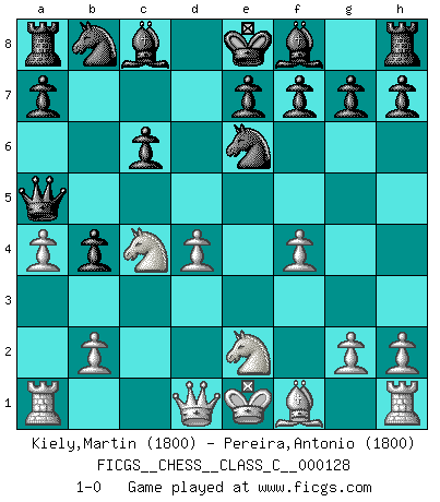 Last move : 1-0 2010 February 25 21:21:30 [Event "FICGS__CHESS__CLASS_C__000128"] [Site "FICGS"] [Date "2009.11.04"] [Round "1"] [White "Kiely,Martin"] [Black "Pereira,Antonio"] [Result "1-0"] [WhiteElo "1800"] [BlackElo "1800"] 1.d4 d5 2.c4 c6 3.Nc3 dxc4 4.e4 b5 5.Nf3 Nf6 6.a4 Qa5 7.Bg5 b4 8.Ne2 Nxe4 9.Ne5 Nxg5 10.f4 Ne6 11.Nxc4 1-0 This chess game has been lost on time (started : 2009.11.04 8:37:9) QGD Slav defense, Alekhine variation Player White won this chess game. Follow this game move after move (download)The passed Pawn is a criminal, who should be kept under lock and key. Mild measures, such as police surveillance, are not sufficient. (Aaron Nimzovich) Der vorletzte Fehler gewinnt. (Savielly Grigorievitsch Tartakower) Yo creo que el Ajedrez posee una magia que es también una ayuda en la edad avanzada. Una rodilla reumática es olvidada durante una partida de Ajedrez y otros eventos pueden parecer algo sin importancia comparada a una catástrofe en el tablero de Ajedrez. (Vlastimil Hort) A ce moment-là, je menaçais de comprendre la position ! (Clément L'Heureux) Who needs drugs and alcohol if he can play Big Chess at FICGS ? (Heinz-Georg Lehnhoff)