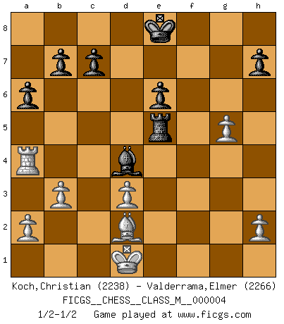 Last move : 1/2-1/2 2006 August 31 9:0:48 [Event "FICGS__CHESS__CLASS_M__000004"] [Site "FICGS"] [Date "2006.04.23"] [Round "1"] [White "Koch,Christian"] [Black "Valderrama,Elmer"] [Result "1/2-1/2"] [WhiteElo "2238"] [BlackElo "2266"] 1.e4 e5 2.Nf3 Nbc6 3.Bb5 Nf6 4.O-O Nxe4 5.d4 Nd6 6.Bxc6 dxc6 7.dxe5 Nf5 8.Qxd8+ Kxd8 9.Rd1+ Ke8 10.Nc3 Ne7 11.Be3 Bg4 12.Rd4 Be6 13.Bd2 c5 14.Ra4 a6 15.Re1 Nc6 16.Ng5 Nd4 17.Nxe6 fxe6 18.Ne2 Rd8 19.Nxd4 cxd4 20.Re4 Bc5 21.Kf1 Rd5 22.Ke2 Rf8 23.f4 g5 24.fxg5 d3+ 25.cxd3 Rf2+ 26.Kd1 Rxg2 27.Re2 Rxe2 28.Kxe2 Bd4 29.b3 Rxe5+ 30.Kd1 1/2-1/2 Comment by player 2 : Elmer Valderrama : The Berlin, a very well known `solid' opening for Black. 9. Rd1+!? also interesting is 9. Nc3 followed by h3 trying to have initiative both in the centre and in the King side. 11. Be3 (+0.53) Novelty, as far as I know. 12...Be6!?, the engines advice is 12..Bxf3 which is not bad too. 15. Re1 (if 15. Ne4 then b5!? and Nc6 <->) 16...Nd4 (weak point Rook @ a4) 19. Nxd4 (19.Bc3!?) 23...g5!? My own attempt to try to get advantange, engines give Kf7 or Rf7 which lead also to drawish positions. 30 Kd1, the White rook will come out after all, and the pawns in g5 and h4-h5 will assure counterplay for White, so the draw offer was accepted. King's knight Opening Kingside Castling by player White (move 4) This chess game ended in a draw. Follow this game move after move (download)I'm not a materialistic person, in that, I don't suffer the lack or loss of money. The absence of worldly goods I don't look back on. For Chess is a way I can be as materialistic as I want without having to sell my soul. (Jamie Walter Adams) Wie ich sie so einen nach dem anderen nieder mähte wurde meine Überlegenheit offensichtlich. (José Raúl Capablanca) Cuando tu no sabes absolutamente que mas hacer, es tiempo de entrar en pánico. (John van der Wiel) Des points faibles ou des trous dans la position de l'adversaire doivent être occupés par des pièces et non pas par des pions. (Siegbert Tarrasch) Vladimir Ras-Putin is still alive... He is also a good actor, I saw him in the Lord of the Rings. (Rodolfo d'Ettorre)