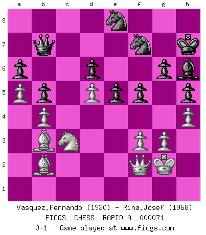 Last move : 0-1 2010 February 19 9:1:52 [Event "FICGS__CHESS__RAPID_A__000071"] [Site "FICGS"] [Date "2009.11.04"] [Round "1"] [White "Vasquez,Fernando"] [Black "Riha,Josef"] [Result "0-1"] [WhiteElo "1930"] [BlackElo "1968"] 1.e4 c5 2.d4 cxd4 3.c3 dxc3 4.Nxc3 Nc6 5.Nf3 d6 6.Bc4 e6 7.O-O a6 8.Qe2 Be7 9.Rd1 Qc7 10.Bf4 Nf6 11.Rac1 O-O 12.Bb3 e5 13.Be3 Qa5 14.h3 Bd7 15.Bg5 Be6 16.Nd5 Qd8 17.Be3 Bxd5 18.exd5 Na5 19.Bc2 b5 20.b3 Nb7 21.Ng5 Qd7 22.b4 Rfc8 23.a3 Rc4 24.Bb3 Rxc1 25.Rxc1 h6 26.Nf3 Rc8 27.Qd1 Nd8 28.Ne1 Ne4 29.Nf3 Rxc1 30.Bxc1 Nf6 31.Bb2 Qf5 32.Nh4 Qe4 33.g3 g6 34.Ng2 Qf5 35.h4 Ng4 36.Qc2 Qd7 37.Bc1 h5 38.Ne3 Nf6 39.Kg2 Qb7 40.f3 Kh7 41.Nd1 Ne8 42.Nc3 f5 43.Qa2 Nf7 44.a4 Nc7 45.a5 Bf8 46.Qf2 Bh6 47.Bb2 Ne8 0-1 This chess game has been lost on time (started : 2009.11.04 12:17:45) Sicilian : Smith-Morra gambit Kingside Castling by player White (move 7) Kingside Castling by player Black (move 11) Player Black won this chess game. Follow this game move after move (download)It's just you and your opponent at the board and you're trying to prove something. (Bobby Fischer) Ich war schon mal beim Dopingtest. Da musste ich Urin abgeben, während Dritte zusahen. (Elisabeth Pähtz) Los tropiezos estan todos ahí en el tablero, esperando que se cometan. (Savielly Tartakover) Des idées, des idées, j'en ai cent, j'en ai mille. Des bonnes, des mauvaises, applicables, irréalisables... Il suffit de faire le tri ! (Roos) Now the reason the enlightened prince and the wise general conquer the enemy whenever they move and their achievements surpass those of ordinary men is foreknowledge. (Sun Tzu)