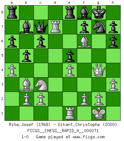 Last move : 1-0 2009 November 7 19:55:7 [Event "FICGS__CHESS__RAPID_A__000071"] [Site "FICGS"] [Date "2009.11.04"] [Round "1"] [White "Riha,Josef"] [Black "Dikant,Christophe"] [Result "1-0"] [WhiteElo "1968"] [BlackElo "2000"] 1.d4 d6 2.e4 Nf6 3.Nc3 e5 4.Nf3 Nbd7 5.Bc4 Be7 6.O-O O-O 7.a4 c6 8.Re1 Qc7 9.h3 b6 10.Bg5 Bb7 11.Qe2 a6 12.dxe5 dxe5 13.Nh4 b5 14.Nf5 Bc5 15.Bb3 Rfe8 16.Qf3 Bf8 17.Rad1 Nc5 18.Nh6+ gxh6 19.Bxf6 Ne6 20.Qg4+ Ng7 21.Rd7 1-0 Queen's Pawn Kingside Castling by player White (move 6) Kingside Castling by player Black (move 6) Player White won this chess game. Follow this game move after move (download)I know people who have all the will in the world, but still can't play good Chess. (Bobby Fischer) Er war ein guter Schachspieler, aber ich kann Leute nicht ausstehen, die 'Heil Hitler' rufen (Über Alexander Aljechin). (Miguel Najdorf) Sin errores no puede haber brillantez. (Emanuel Lasker) On n'a jamais que l'âge auquel on a commence à jouer aux échecs car après on cesse de vieillir. (Capablanca) Perseverance does not equal worthiness. Next time you want to get my attention, wear something fun. Low-riding jeans are hot. (Gregory House, House M.D.)