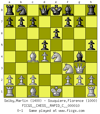 Last move : 0-1 2006 December 3 22:56:52 [Event "FICGS__CHESS__RAPID_C__000010"] [Site "FICGS"] [Date "2006.10.02"] [Round "1"] [White "Selby,Martin"] [Black "Souquiere,Florence"] [Result "0-1"] [WhiteElo "1400"] [BlackElo "1000"] 1.e4 d6 2.Bc4 Bd7 3.Qf3 Nf6 4.Nc3 Bg4 5.Qg3 h5 6.Nf3 Nxe4 7.Nxe4 e6 8.d4 d5 0-1 King's pawn Opening Player Black won this chess game. Follow this game move after move (download)Look at Garry Kasparov. After he loses, invariably he wins the next game. He just kills the next guy. That's something that we have to learn to be able to do. (Maurice Ashley) Deine Wertungszahl - vorausgesetzt einige Jahre schachliche Anstrengung - entspricht etwa dem zehnfachen Deines IQ plus 1000. (Jonathan Levitt) Debemos de asegurarnos de que el Ajedrez no se convierta en un lenguaje muerto, muy interesante, pero tan solo para un grupo muy pequeño. (Sytze Faber) Des combinaisons [dans le jeu d'échecs] pareilles à des mélodies. Je crois entendre pour ainsi dire la musique des coups... (Vladimir Nabokov) Hold em is to stud what chess is to checkers. (Johnny Moss)