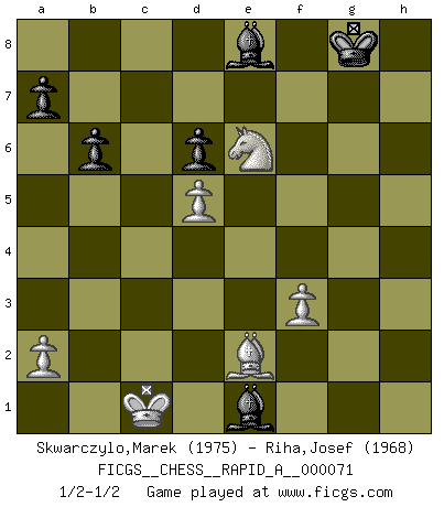 Last move : 1/2-1/2 2009 November 23 14:59:35 [Event "FICGS__CHESS__RAPID_A__000071"] [Site "FICGS"] [Date "2009.11.04"] [Round "1"] [White "Skwarczylo,Marek"] [Black "Riha,Josef"] [Result "1/2-1/2"] [WhiteElo "1975"] [BlackElo "1968"] 1.d4 Nf6 2.Nf3 g6 3.c4 Bg7 4.Nc3 d5 5.cxd5 Nxd5 6.e4 Nxc3 7.bxc3 c5 8.Be3 Qa5 9.Qd2 Nc6 10.Rc1 cxd4 11.cxd4 Qxd2+ 12.Kxd2 O-O 13.d5 Rd8 14.Ke1 Na5 15.Bf4 Bd7 16.Bd3 f5 17.Nd2 fxe4 18.Bxe4 Rac8 19.Ke2 b6 20.Ke3 Nb7 21.f3 Bb2 22.Rxc8 Rxc8 23.Rb1 Bf6 24.Nb3 Rc3+ 25.Kd2 Bb5 26.Rc1 Rxc1 27.Kxc1 Nd6 28.Nd2 g5 29.Bg3 h5 30.Bc2 h4 31.Bxd6 exd6 32.Ne4 Be5 33.g3 Be2 34.Bd1 hxg3 35.hxg3 Bd3 36.Nxg5 Bxg3 37.Ne6 Be1 38.Nf4 Bb5 39.Be2 Be8 40.Ne6 1/2-1/2 King's Indian : East Indian defense Kingside Castling by player Black (move 12) This chess game ended in a draw. Follow this game move after move (download)Morphy was probably the greatest genius of them all. (Bobby Fischer) Gewöhnliche Menschen denken nur daran, wie sie ihre Zeit verbringen. Ein intelligenter Mensch versucht, sie auszunutzen. (Arthur Schopenhauer) Tu sabes que vas a perder. Aún cuando tenía la ventaja, yo sabía que iba a perder. - al estar jugando con Fischer (Andrew Soltis) Je menace de comprendre la position. (Anonyme) You have to believe in yourself. (Sun Tzu)