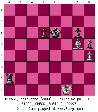 Last move : 0-1 2009 November 27 13:57:26 [Event "FICGS__CHESS__RAPID_A__000071"] [Site "FICGS"] [Date "2009.11.04"] [Round "1"] [White "Dikant,Christophe"] [Black "Deline,Ralph"] [Result "0-1"] [WhiteElo "2000"] [BlackElo "1912"] 1.d4 Nf6 2.Nf3 g6 3.Bf4 Bg7 4.e3 O-O 5.Be2 c5 6.c3 Qb6 7.Qb3 Na6 8.Nbd2 d6 9.Qxb6 axb6 10.O-O Nc7 11.Nb3 cxd4 12.exd4 b5 13.Nbd2 b4 14.c4 b5 15.cxb5 Nfd5 16.Bg3 Bd7 17.Bc4 Bxb5 18.Rfe1 Bxc4 19.Nxc4 h6 20.Ne3 Ra4 21.a3 Rfa8 22.Rab1 bxa3 23.bxa3 Rxa3 24.h3 Ra2 25.Rb7 R8a7 26.Rxa7 Rxa7 27.Rb1 Nc3 28.Rb2 Ne6 29.Rd2 f5 30.d5 f4 31.dxe6 fxe3 32.fxe3 Ne4 33.Be1 Nxd2 34.Bxd2 Ba1 35.Kf2 Ra2 36.Ke1 Kg7 37.Nd4 Bxd4 38.exd4 Kf6 39.d5 h5 40.h4 Ke5 41.Bg5 Kxd5 42.Bxe7 Rxg2 43.Kf1 Ra2 44.Bg5 Kxe6 0-1 King's Indian : London system Kingside Castling by player Black (move 4) Kingside Castling by player White (move 10) 10 pieces endgame at move 42 : White KBPPP , Black KRPPP WHITE : King + 1 Bishop 3 Pawns BLACK : King + 1 Rook 3 Pawns 9 pieces endgame at move 42 : White KBPP , Black KRPPP WHITE : King + 1 Bishop 2 Pawns BLACK : King + 1 Rook 3 Pawns 8 pieces endgame at move 44 : White KBP , Black KRPPP WHITE : King + 1 Bishop 1 Pawn BLACK : King + 1 Rook 3 Pawns Player Black won this chess game. Follow this game move after move (download)Man is a frivolous, a specious creature, and like a Chess player, cares more for the process of attaining his goal than for the goal itself. (Dostoyevsky) Wenn Dein Gegner dir ein Remis anbietet, versuch herauszufinden, weshalb er glaubt schlechter zu stehen. (Nigel Short) Tu eres para mi la Reina en d8 y yo soy el Peón en d7!!. (GM Eduard Gufeld) A ce moment-là, je menaçais de comprendre la position ! (Clément L'Heureux) Whoever said the pen is mightier than the sword obviously never encountered automatic weapons. (US General Douglas MacArthur)
