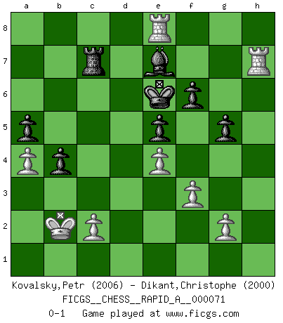 Last move : 0-1 2009 December 5 19:42:16 [Event "FICGS__CHESS__RAPID_A__000071"] [Site "FICGS"] [Date "2009.11.04"] [Round "1"] [White "Kovalsky,Petr"] [Black "Dikant,Christophe"] [Result "0-1"] [WhiteElo "2006"] [BlackElo "2000"] 1.e4 d6 2.d4 Nf6 3.Nc3 e5 4.dxe5 dxe5 5.Qxd8+ Kxd8 6.a3 Bd6 7.Bc4 Ke7 8.Nf3 c6 9.Be3 Nbd7 10.O-O-O Bc7 11.Rhg1 Ng4 12.Bg5+ f6 13.Bh4 Nb6 14.Ba2 Be6 15.Bxe6 Kxe6 16.Ne1 g5 17.Bg3 Nd7 18.Nd3 a5 19.h3 Nh6 20.f3 b5 21.Bf2 Bd6 22.a4 b4 23.Nb1 Nf7 24.Nd2 c5 25.b3 Rhc8 26.Nc4 Ra6 27.Ndb2 Be7 28.h4 h6 29.hxg5 hxg5 30.Ne3 Nd6 31.Rh1 Nb6 32.Rh7 Bf8 33.Kb1 c4 34.bxc4 Nbxc4 35.Nbxc4 Nxc4 36.Nxc4 Rxc4 37.Rd8 Be7 38.Re8 Rc7 39.Bc5 R6a7 40.Bxa7 Rxa7 41.Kb2 Rc7 0-1 Pirc defense Queenside Castling by player White (move 10) Player Black won this chess game. Follow this game move after move (download)Weak points or holes in the opponent's position must be occupied by pieces not Pawns. (Siegbert Tarrasch) Schach ist Kampf, hauptsächlich jedoch gegen die eigenen Fehler. (Savielly Grigorievitsch Tartakower) El jugador táctico sabe que hacer cuando hay algo que hacer; mientras que el estratega sabe que hacer cuando no hay nada que hacer. (Gerald Abrahams) Les erreurs sont comme les malheurs, elles n'arrivent jamais seules. (Siegbert Tarrasch) To err is human, but to really foul things up requires a computer. (Farmer's Almanac, 1978)