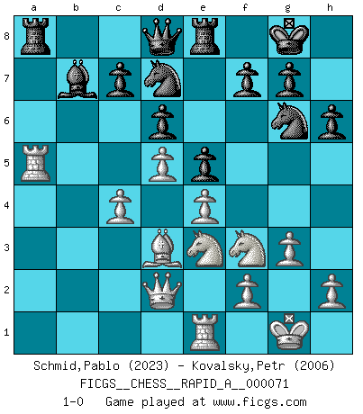 Last move : 1-0 2010 January 7 19:27:43 [Event "FICGS__CHESS__RAPID_A__000071"] [Site "FICGS"] [Date "2009.11.04"] [Round "1"] [White "Schmid,Pablo"] [Black "Kovalsky,Petr"] [Result "1-0"] [WhiteElo "2023"] [BlackElo "2006"] 1.e4 e5 2.Nf3 Nc6 3.Bc4 Bc5 4.b4 Bxb4 5.c3 Bd6 6.d4 Nf6 7.O-O O-O 8.Re1 h6 9.Na3 a6 10.Bd3 b5 11.Nc2 Re8 12.Bd2 Bb7 13.a4 bxa4 14.Rxa4 a5 15.d5 Ne7 16.c4 Ng6 17.g3 Bc5 18.Be3 Bxe3 19.Nxe3 d6 20.Qd2 Nd7 21.Rxa5 1-0 Evans gambit : Stone-Ware variation Kingside Castling by player White (move 7) Kingside Castling by player Black (move 7) Player White won this chess game. Follow this game move after move (download)A thorough understanding of the typical mating continuations makes the most complicated sacrificial combinations leading up to them not only not difficult, but almost a matter of course. (Siegbert Tarrasch) Ich habe Putins Aufstieg an die Macht beobachtet und seine Politik, die demokratischen Institutionen meines Landes zu zerstören. (Garry Kasparov) De eso se trata el Ajedrez. Un día le das una lección a tu oponente y al día siguiente el te da una a tí. (Bobby Fischer) Ne tendez aucun piège pour le plaisir ! Ne jouez rien dans l'espoir que l'adversaire réagisse de façon stupide ! Prenez toujours pour acquis que l'adversaire va trouver le meilleur coup ! Ne jouez jamais de coup dans l'espoir que l'adversaire ne voie pas la menace ! Chacun de vos coups doit améliorer la position d'une façon ou d'une autre. If you are going through hell, keep going. (Winston Churchill)