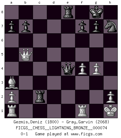 Last move : 0-1 2009 November 4 20:15:14 [Event "FICGS__CHESS__LIGHTNING_BRONZE__000074"] [Site "FICGS"] [Date "2009.11.04"] [Round "1"] [White "Gezmis,Deniz"] [Black "Gray,Garvin"] [Result "0-1"] [WhiteElo "1800"] [BlackElo "2068"] 1.d4 Nf6 2.Nf3 d5 3.e3 c5 4.c3 e6 5.Nbd2 Nc6 6.Bd3 Bd6 7.Qe2 c4 8.Bc2 e5 9.dxe5 Nxe5 10.Nxe5 Bxe5 11.e4 O-O 12.O-O Re8 13.f4 Bg4 14.Nf3 Bxc3 15.bxc3 dxe4 16.Qxc4 exf3 17.gxf3 Rc8 18.Qb5 Rxc3 19.Bxh7+ Nxh7 20.fxg4 Rc2 21.Ba3 Qd4+ 22.Kh1 Qe4+ 0-1 This chess game has been lost on time (started : 2009.11.04 15:59:22) Comment by player 1 : Deniz Gezmis : Hey dude, Can we abort this game? Coz i have to go out. Queen's pawn game Kingside Castling by player Black (move 11) Kingside Castling by player White (move 12) Player Black won this chess game. Follow this game move after move (download)You have to have the fighting spirit. You have to force moves and take chances. (Bobby Fischer) Die Idee von Capablanca, Schach als Fach in den Schulen zu lehren, ist großartig. (Fidel Castro) Sin errores no puede haber brillantez. (Emanuel Lasker) Le temps de noter son nom sur la feuille de partie, j'étais déjà en zeitnot ! D'un modeste amateur apparié lors de la première ronde d'un open contre le grand-maître Azmaïparashvili. In God we trust, all others we virus scan. (Anonymous)