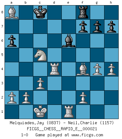 Last move : 1-0 2009 November 28 10:15:51 [Event "FICGS__CHESS__RAPID_E__000021"] [Site "FICGS"] [Date "2009.11.05"] [Round "1"] [White "Melquiades,Jay"] [Black "Neil,Charlie"] [Result "1-0"] [WhiteElo "0837"] [BlackElo "1157"] 1.e4 e6 2.Nf3 d5 3.d3 c5 4.Nc3 Nc6 5.e5 Nge7 6.Bg5 Qc7 7.d4 Nf5 8.g4 Nfxd4 9.Nb5 Nxf3+ 10.Qxf3 Qa5+ 11.Bd2 Qd8 12.c3 a6 13.Na3 Qc7 14.h4 Qxe5+ 15.Be2 Bd6 16.O-O-O d4 17.Rhe1 Bd7 18.Nc4 Qd5 19.Qxd5 exd5 20.Bf3 Be6 21.Nxd6+ Kd7 22.Nxb7 Kc7 23.Nxc5 Rhe8 24.Bf4+ Kc8 25.Bxd5 Kd8 26.Bxc6 Rf8 27.Rxd4+ Kc8 28.Bxa8 1-0 French defense Queenside Castling by player White (move 16) Player White won this chess game. Follow this game move after move (download)A man without frontiers. He didn't divide the East and the West, he brought them together in their admiration for him. (Ljubomir Ljubojevic, about Bobby Fischer's death) Ich organisiere ein großes Turnier, was mich etwa 120000 Dollar kostet. Ich denke, das ist das erste Mal in der Schachgeschichte, daß ein Schachgroßmeister auch als Mäzen auftritt. (Miguel Najdorf) Si tu oponente te ofrece un empate, trata de averiguar porque piensa él que esta en una posición peor. (Nigel Short) J'ai toujours senti une vague pitié pour l'homme qui ne connaît rien aux échecs, tout comme j'en aurais pour un homme ignorant de l'amour. Les Echecs, comme la musique ou comme l'amour, ont le pouvoir de rendre heureux. (Siegbert Tarrasch) All politicians must be presumed guilty until they are proven innocent. (Dinesh De Silva)