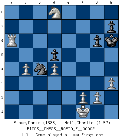 Last move : 1-0 2009 December 4 18:52:7 [Event "FICGS__CHESS__RAPID_E__000021"] [Site "FICGS"] [Date "2009.11.05"] [Round "1"] [White "Pipac,Darko"] [Black "Neil,Charlie"] [Result "1-0"] [WhiteElo "1325"] [BlackElo "1157"] 1.e4 e6 2.d4 d5 3.exd5 exd5 4.Nf3 Bg4 5.Nc3 Bb4 6.Qe2+ Qe7 7.Qxe7+ Nxe7 8.Bg5 c6 9.Bxe7 Kxe7 10.Be2 Re8 11.O-O Nd7 12.a3 Kf8 13.Rfe1 Bd6 14.h3 Bf5 15.Bd3 Bxd3 16.cxd3 Nf6 17.b4 Rxe1+ 18.Rxe1 Re8 19.Kf1 b5 20.Ne5 Bxe5 21.dxe5 Nd7 22.d4 Nb6 23.Ra1 Nc4 24.a4 a6 25.axb5 cxb5 26.Rxa6 g6 27.Nxb5 Rd8 28.Nc7 Kg7 29.e6 fxe6 30.Nxe6+ Kh6 31.Nxd8 1-0 French : Exchange variation Kingside Castling by player White (move 11) Player White won this chess game. Follow this game move after move (download)All I want to do, ever, is just play Chess. (Bobby Fischer) Ohne ihre Erfolge schmälern zu wollen würde ich sagen Petrosian, Spassky und Karpov verdanken ihre Siege ihren Trainern - Boleslavsky, Bondarevsky und Furman. (Mikhail Moiseyevich Botvinik) Peones: ellos son el alma de esta partida, solos forman el ataque y la defensa. (Philidor) L'action d'une oeuvre littéraire se déroule sur un champ de bataille. Les masques et les types du drame moderne correspondent aux pièces du jeu d'échecs. L'intrigue correspond aux coups et aux gambits, c'est à dire aux techniques du jeu telles qu'utilisées et interprétées par les joueurs. Les tactiques et les péripéties [mouvements] correspondent aux coups exécutés par l'adversaire. (Viktor Shklovsky) Some people are so afraid to die that they never begin to live. (Henry Van Dyke)