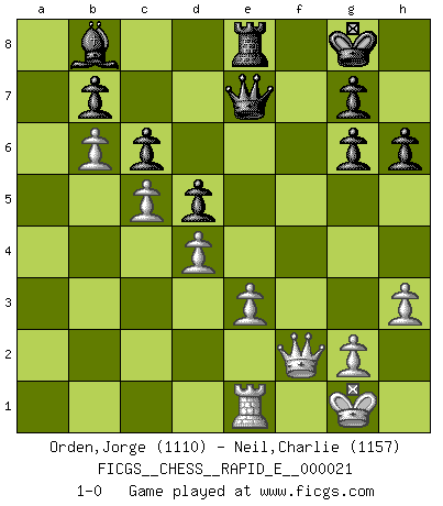 Last move : 1-0 2009 December 2 21:43:35 [Event "FICGS__CHESS__RAPID_E__000021"] [Site "FICGS"] [Date "2009.11.05"] [Round "1"] [White "Orden,Jorge"] [Black "Neil,Charlie"] [Result "1-0"] [WhiteElo "1110"] [BlackElo "1157"] 1.e4 e6 2.Nf3 d5 3.exd5 exd5 4.d4 Bd6 5.h3 Ne7 6.Be2 Be6 7.O-O Nd7 8.a3 O-O 9.Be3 Nf6 10.b3 Ne4 11.c4 c6 12.c5 Bc7 13.b4 Nf5 14.Nbd2 a5 15.Bd3 Nxd2 16.Qxd2 Nxe3 17.fxe3 axb4 18.axb4 Qd7 19.Ng5 h6 20.Nxe6 Qxe6 21.Qf2 Qe7 22.Rxa8 Rxa8 23.b5 Re8 24.Bg6 fxg6 25.b6 Bb8 26.Re1 1-0 French defense Kingside Castling by player White (move 7) Kingside Castling by player Black (move 8) Player White won this chess game. Follow this game move after move (download)We must make sure that Chess will not be like a dead language, very interesting, but for a very small group. (Sytze Faber) Vielleicht wirkt die Aura früherer Spieler glanzvoller als die der heutigen Spieler, aber das liegt daran, dass man kein Programm wie Fritz hatte, das einem all die Löcher in ihren Partien zeigt. (Vladimir Kramnik) El Ajedrez es despiadado: debes de estar preparado para matar gente. (Nigel Short) La conception d'un plan est le processus par lequel un joueur exploite les avantages de sa position tout en s'efforçant d'en réduire au minimum les inconvénients. Afin de garantir le succès, un plan doit toujours se fonder sur un diagnostic objectif des particularités d'une position. La conception d'un plan est d'autant plus difficile que la position est équilibrée, et grandement facilitée lorsqu'il n'existe qu'un seul plan susceptible de répondre aux exigences de la position. (Harry Golombek) If you have any trouble condescending, find a Unix user to show you how it's done. (Scott Adams)