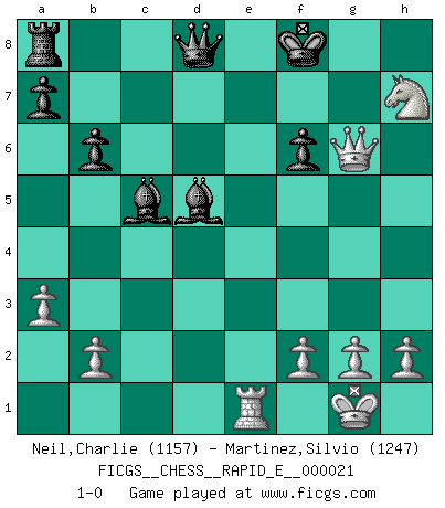 Last move : 1-0 2010 February 13 12:44:29 [Event "FICGS__CHESS__RAPID_E__000021"] [Site "FICGS"] [Date "2009.11.05"] [Round "1"] [White "Neil,Charlie"] [Black "Martinez,Silvio"] [Result "1-0"] [WhiteElo "1157"] [BlackElo "1247"] 1.d4 Nf6 2.Nf3 d5 3.c4 c5 4.dxc5 Nc6 5.e3 e6 6.cxd5 exd5 7.Nc3 Bxc5 8.Be2 O-O 9.a3 d4 10.exd4 Nxd4 11.O-O Nxe2+ 12.Qxe2 Re8 13.Qc4 b6 14.Bg5 h6 15.Bh4 Be6 16.Qf4 g5 17.Bxg5 hxg5 18.Qxg5+ Kf8 19.Rfe1 Nh7 20.Qh6+ Kg8 21.Ne4 Bd5 22.Neg5 Nxg5 23.Nxg5 Rxe1+ 24.Rxe1 f6 25.Qg6+ Kf8 26.Nh7+ 1-0 Queen's pawn game Kingside Castling by player Black (move 8) Kingside Castling by player White (move 11) Player White won this chess game. Follow this game move after move (download)You cannot play at Chess if you are kind-hearted. (French Proverb) Ich liebe den Moment, wenn ich das Ego meines Gegenüber breche. (Robert James Fischer) En el tablero, la mentira e hipocresía no sobreviven mucho. (Emanuel Lasker) Que feriez-vous si vous étiez en train de jouer aux échecs et que la fin du monde arrive ? Je continuerais à jouer. (Saint Borromée) To steal ideas from one person is plagiarism. To steal from many is research. (Unknown)