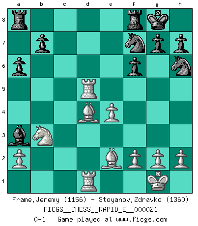 Last move : 0-1 2009 November 20 8:56:51 [Event "FICGS__CHESS__RAPID_E__000021"] [Site "FICGS"] [Date "2009.11.05"] [Round "1"] [White "Frame,Jeremy"] [Black "Stoyanov,Zdravko"] [Result "0-1"] [WhiteElo "1156"] [BlackElo "1360"] 1.e4 c5 2.Nf3 a6 3.c3 d6 4.d4 e5 5.dxe5 Bg4 6.exd6 Bxf3 7.Qxf3 Qxd6 8.Be3 Qb6 9.Bc4 f6 10.O-O Qxb2 11.Nd2 Qxc3 12.Rac1 Qe5 13.Bf4 Qd4 14.Nb3 Qd8 15.Rfd1 Qb6 16.Be3 Nd7 17.Be2 Ne5 18.Qf5 Ne7 19.Bxc5 Nxf5 20.Bxb6 Nh6 21.Rd5 Ba3 22.Rcd1 O-O 23.Bd4 Nef7 0-1 Sicilian : O'Kelly variation Kingside Castling by player White (move 10) Kingside Castling by player Black (move 22) Player Black won this chess game. Follow this game move after move (download)A bad plan is better than none at all. (Frank Marshall) Oft bringt ein stiller Zug das Erdbeben. (Richard Reti) Entre mas años cumplo, mas valoro los Peones. (Keres) RxDa4 pat (...) Wikichess, chess moves explained by 'experimented' players. (Thibault de Vassal)